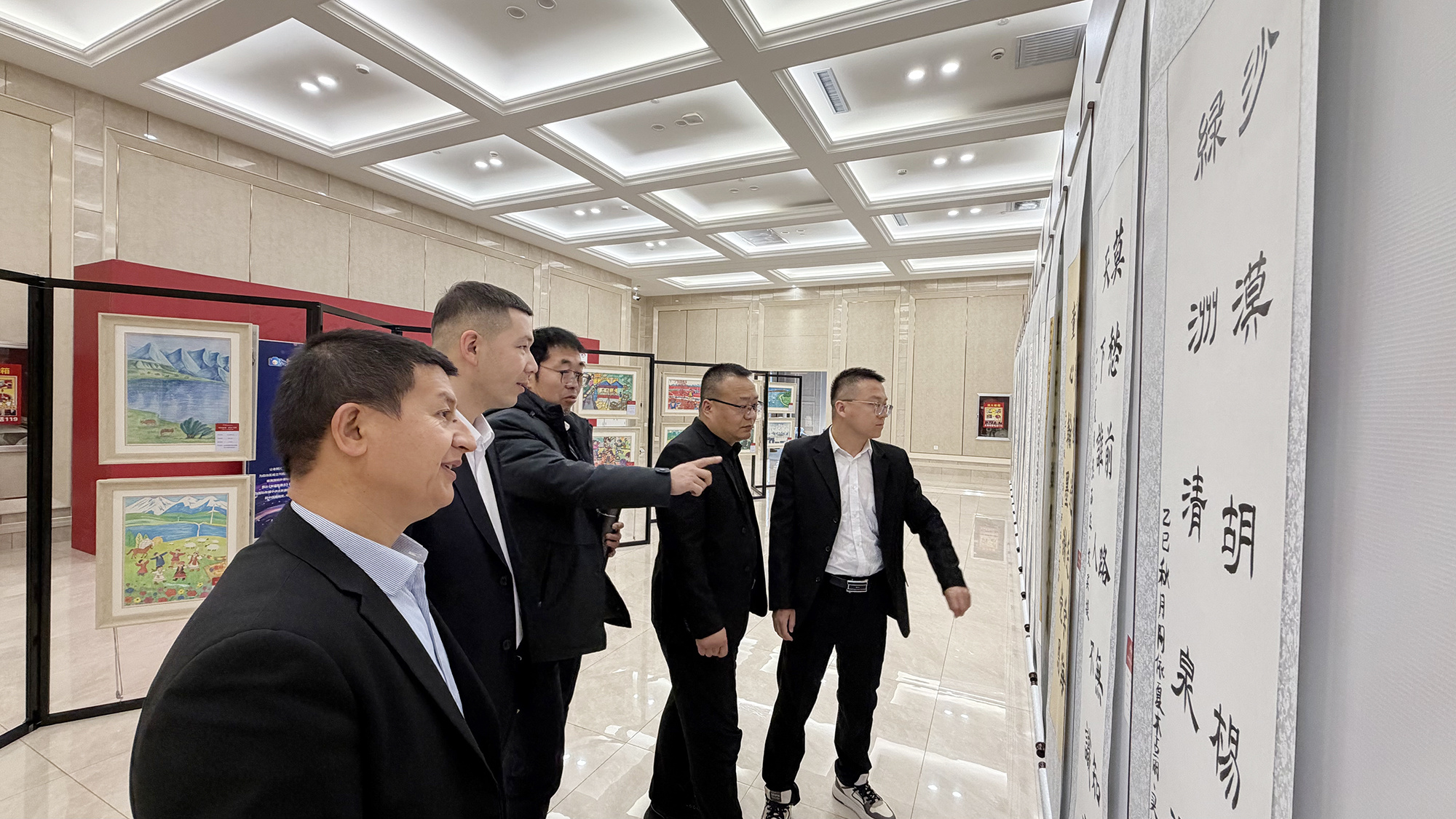 1月26日,出席新疆维吾尔自治区政协十三届四次会议的政协委员在新疆昆仑宾馆观看“童绘新疆”“中国娃写中国字”书画作品成果展。(摄影:邹懿)