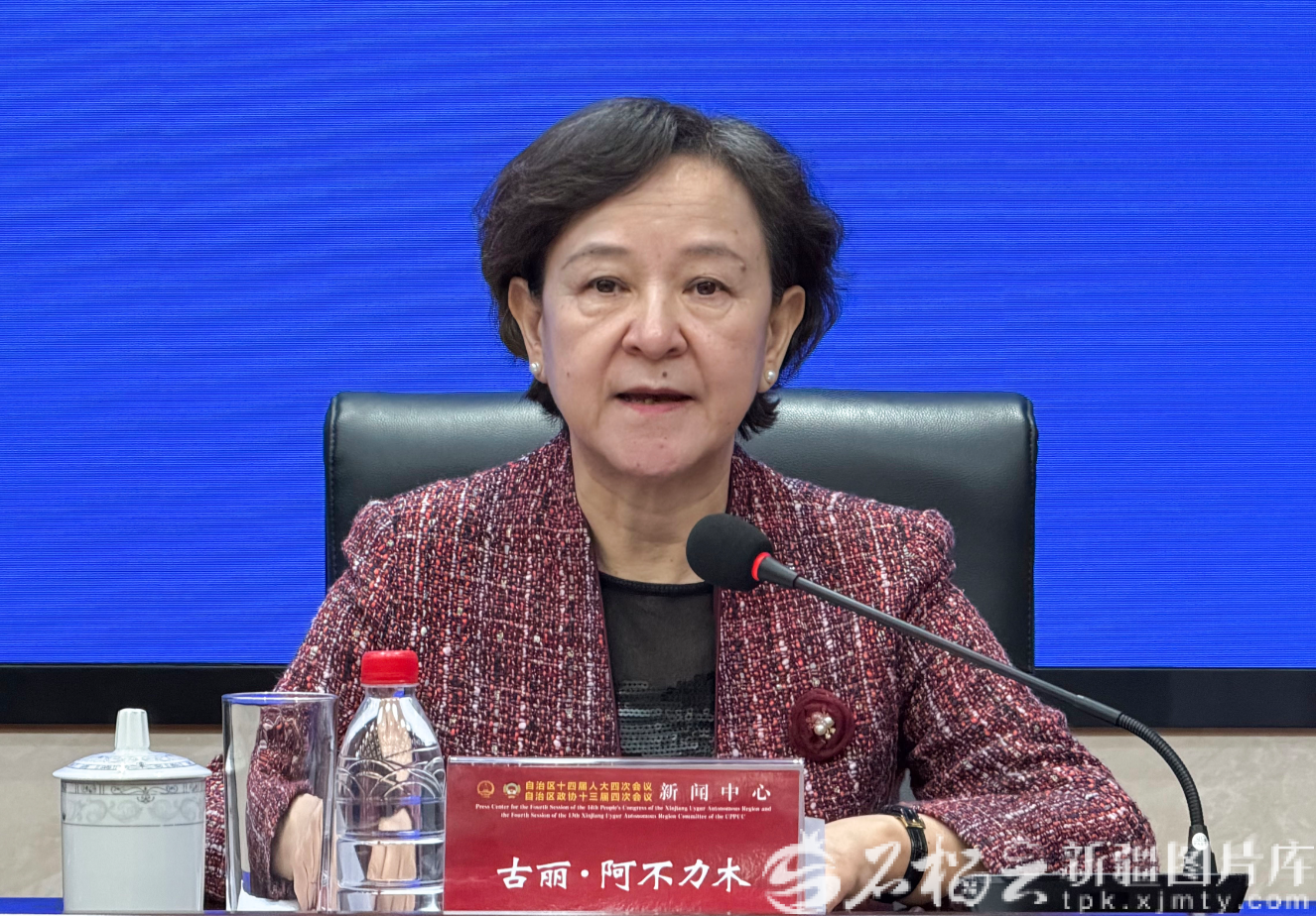 1月28日,2026新疆两会第三场新闻发布会举行。图为古丽·阿不力木作介绍。石榴云/新疆日报记者 李瑞摄