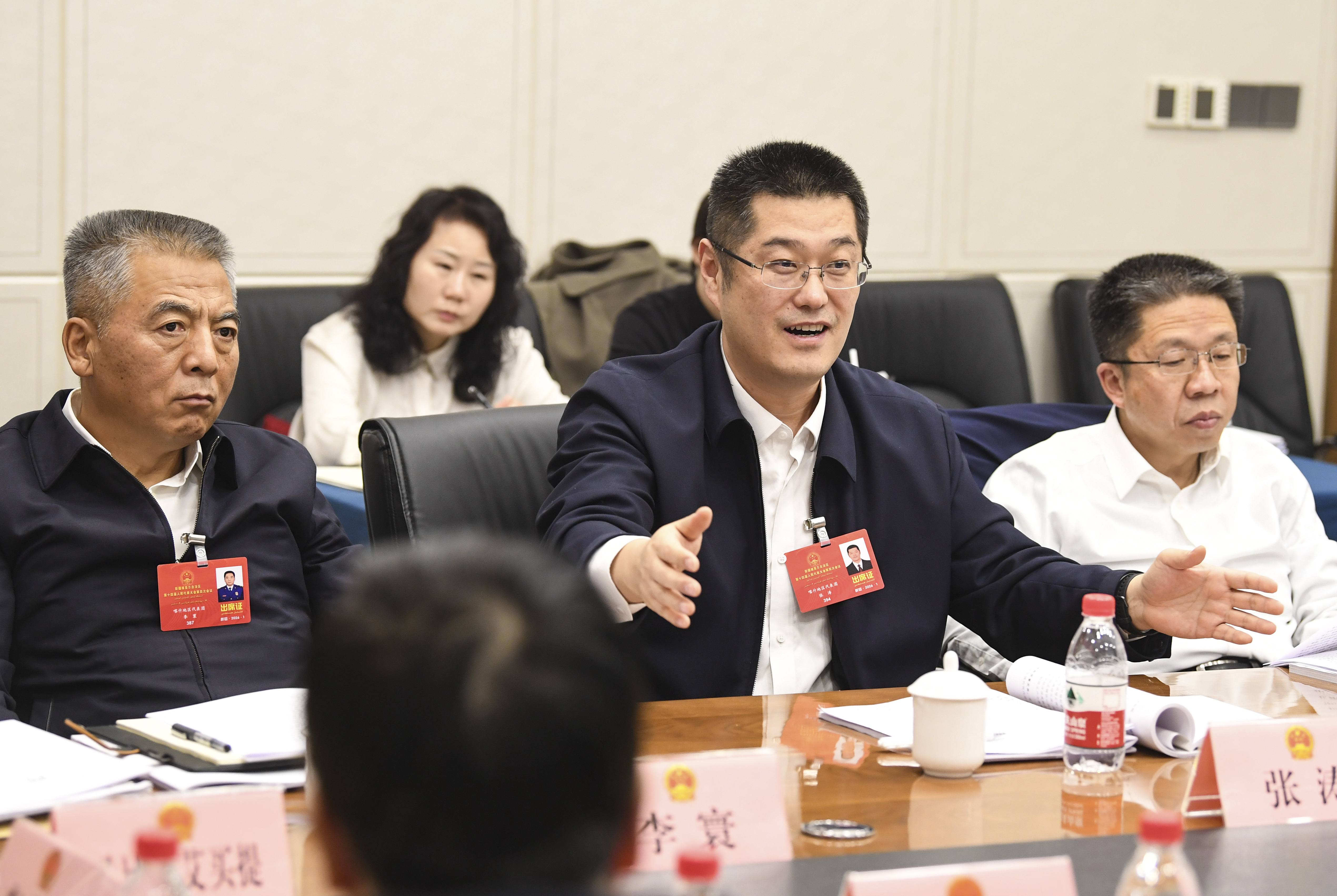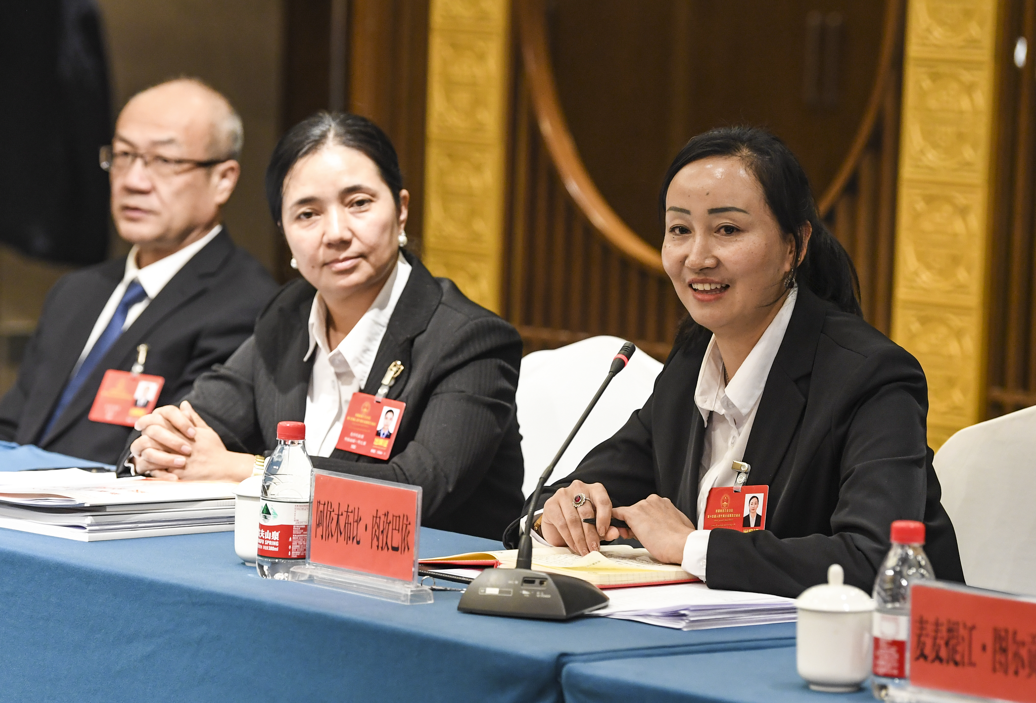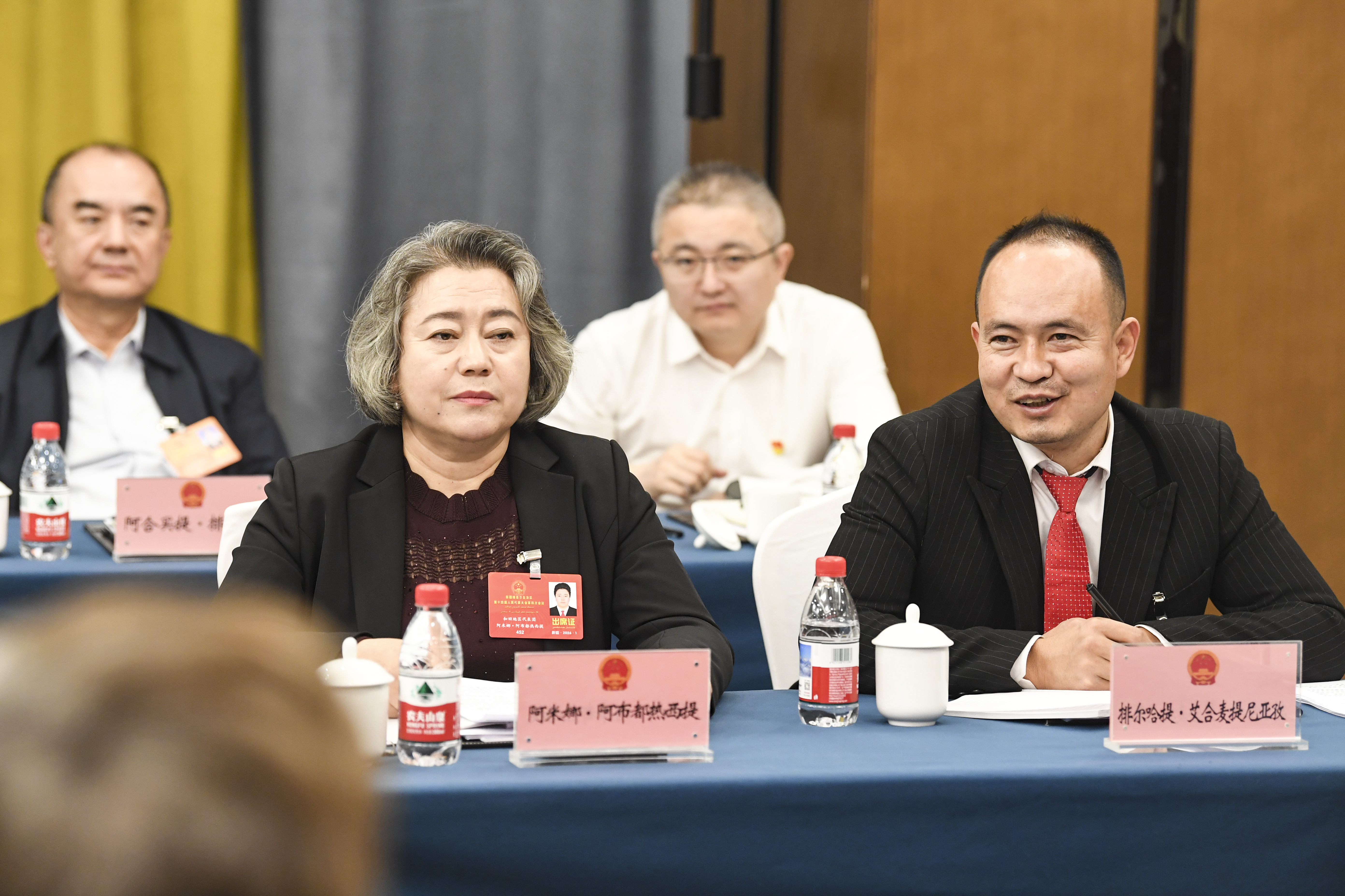 1月28日,排尔哈提·艾合麦提尼亚孜代表(右一)在参加和田地区代表团审议时,就坚持协调发展,促进乡村振兴等内容发言。石榴云/新疆日报记者 汤永摄