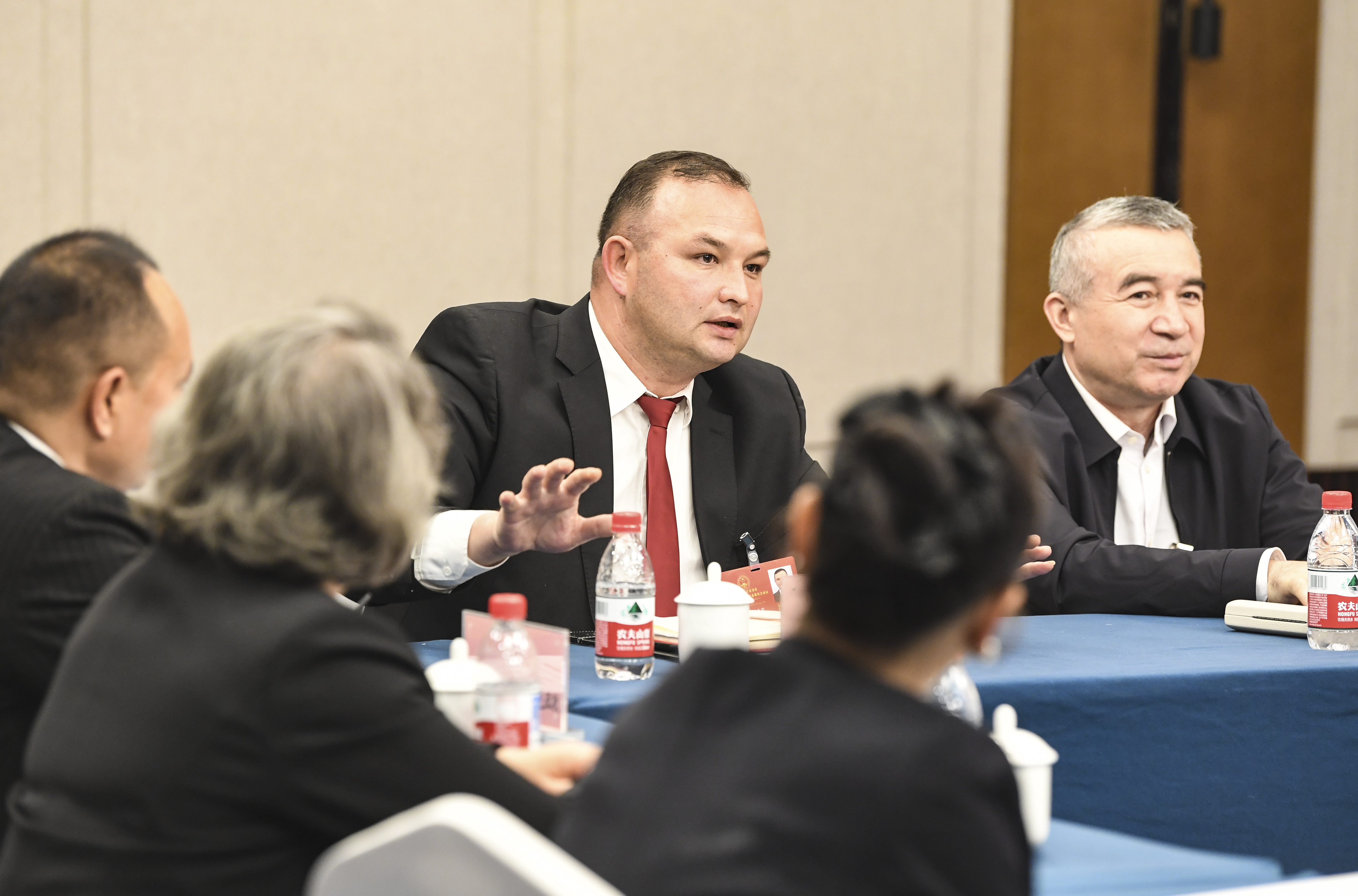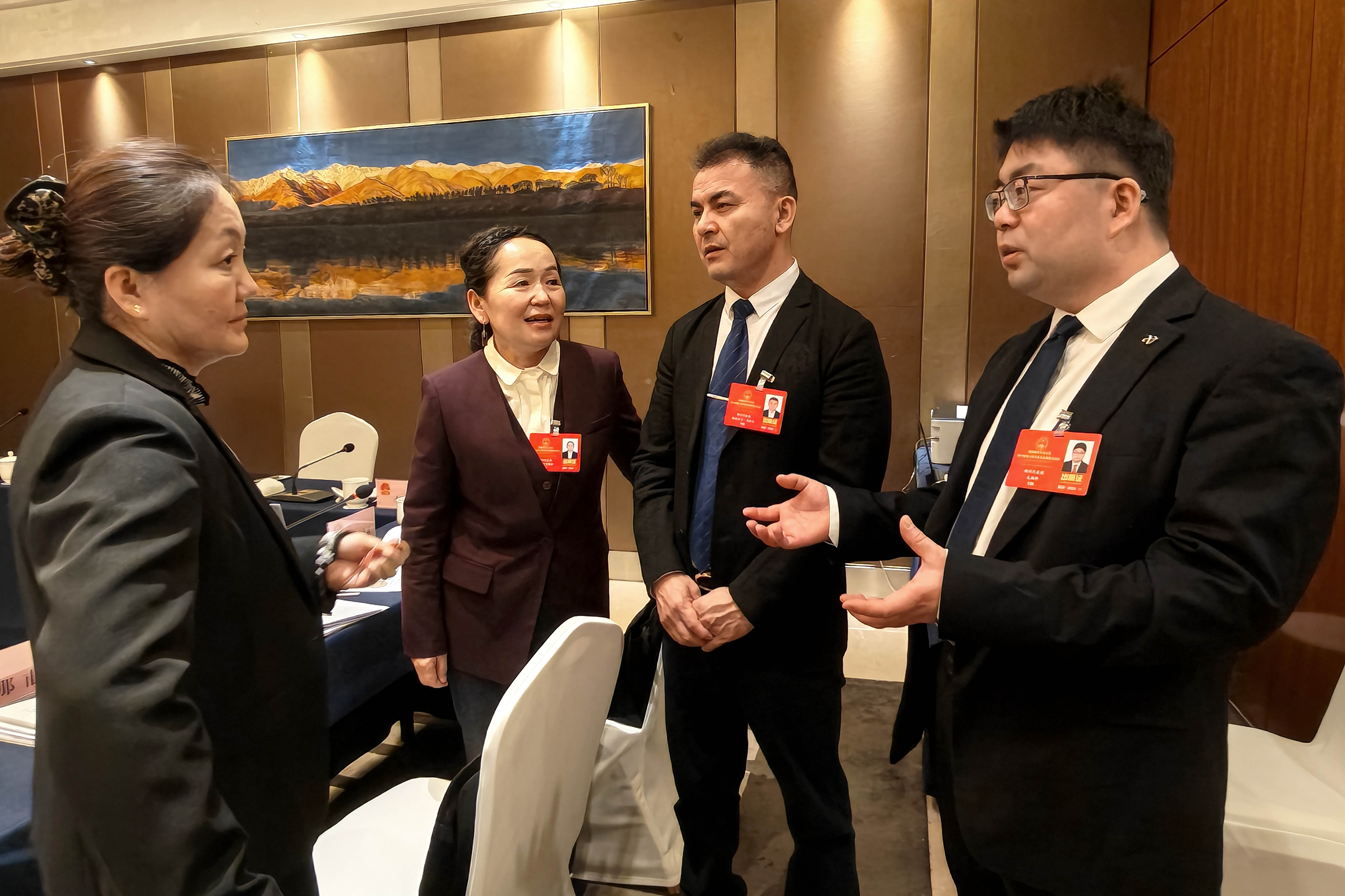 图为博尔塔拉蒙古自治州代表团代表在会议间隙一起交流。石榴云/新疆日报记者 蔡增乐摄