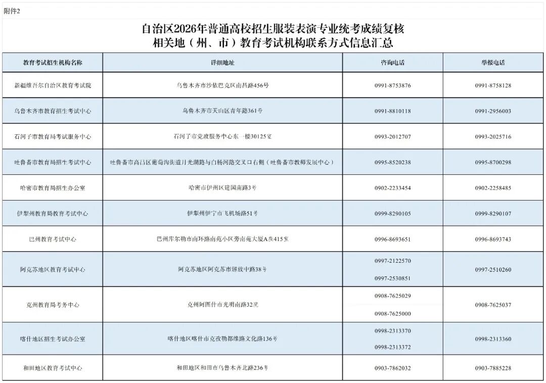 成绩复核程序:成绩复核工作由新疆教育考试院统筹实施。各地(州、市)教育考试机构具体负责属地考生成绩复核工作(新疆教育考试院不直接接受考生个人复核申请)。申请成绩复核的考生自行下载并填写《自治区2026年普通高校招生服装表演专业统考成绩复核申请表》(附件1),于2月4日至6日12时向生源所在地(州、市)教育考试机构提出成绩复核书面申请,逾期不再受理。复核结果由各地(州、市)教育考试机构向考生反馈。
