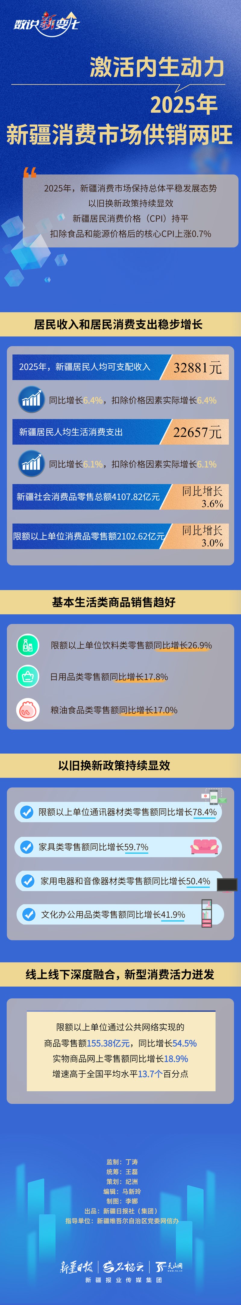 A+ A. A-2025年,新疆立足全方位挖掘内需潜力,积极实施提振消费专项行动,通过创新消费场景、优化消费环境等一系列务实举措为消费市场平稳发展提供了有力支撑。这一年,新疆消费市场表现如何?今天的《数说“新”变化》一起来看看。