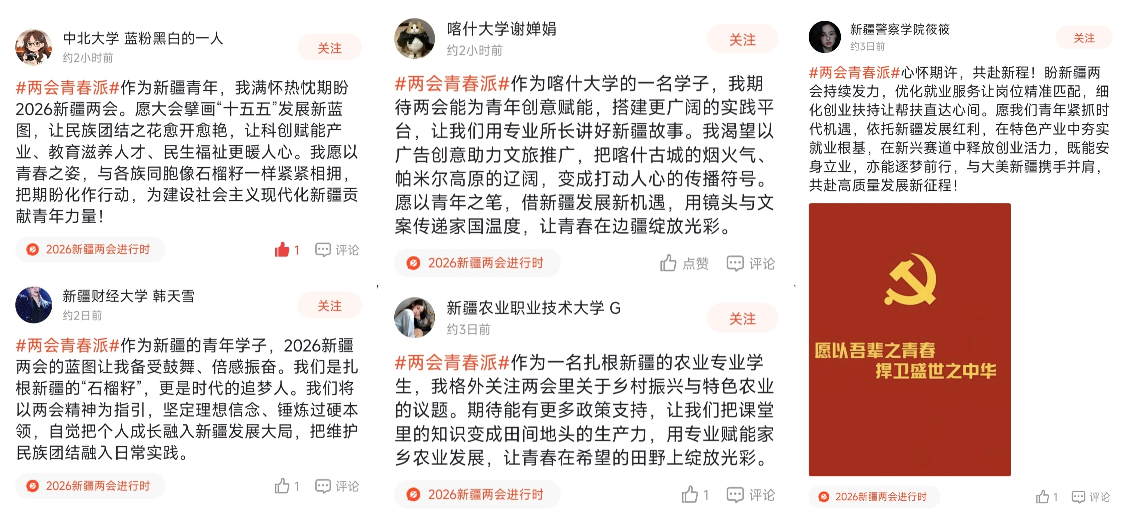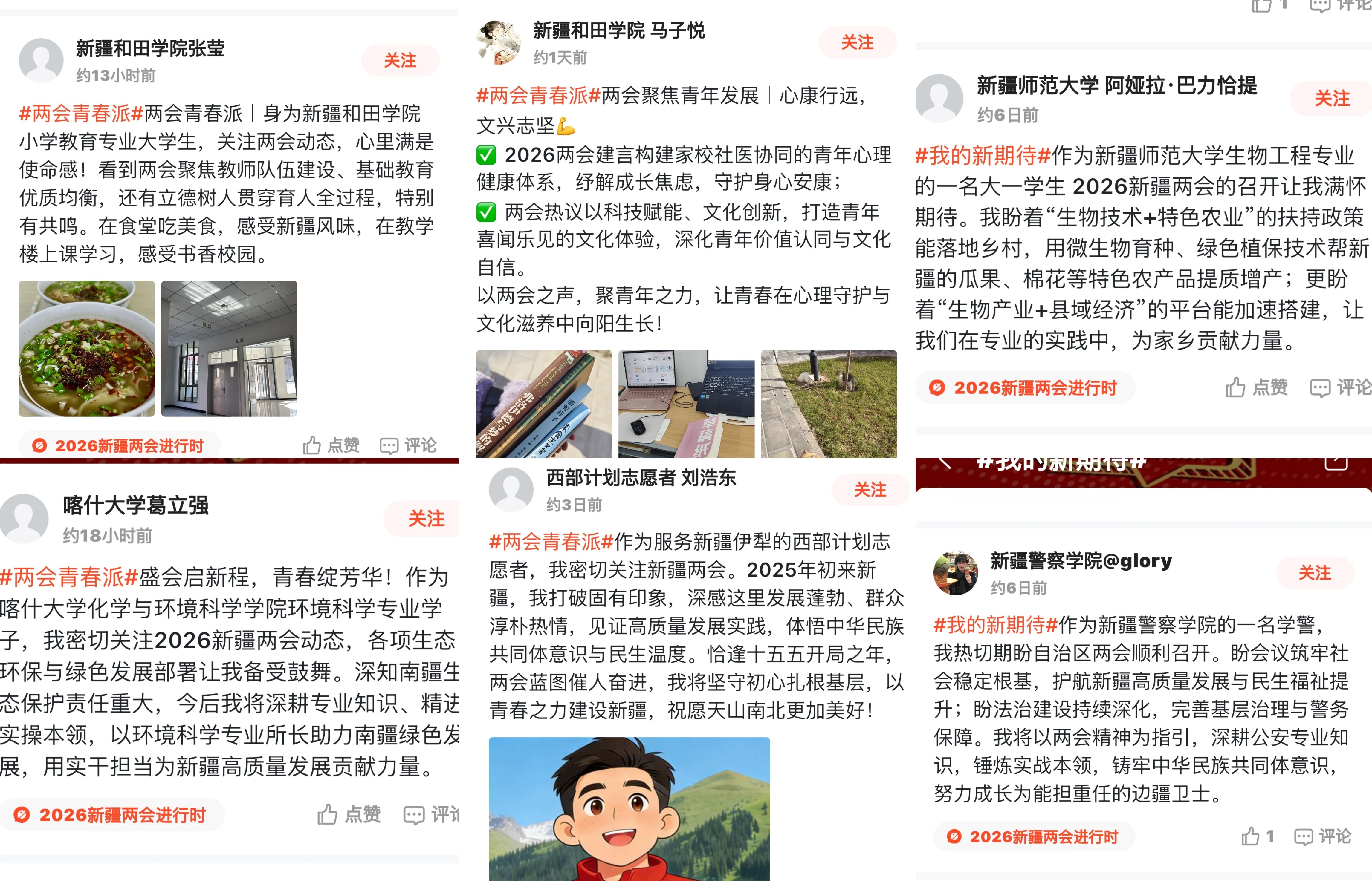 A+ A. A-青年不仅是未来,更是时代的参与者和建言者。在2026年自治区两会召开期间,为助力青年朋友们牢牢把握时代机遇、融入新疆发展大局,1月24日,石榴云客户端联合自治区团委、石榴云新疆高校新媒体工作室(联盟),推出“两会青春派”2026年自治区两会石榴圈话题征集活动。截至2月2日,已累计有千余位高校师生参与话题讨论,他们围绕新疆发展各抒己见,展现出新时代青年的担当与智慧。