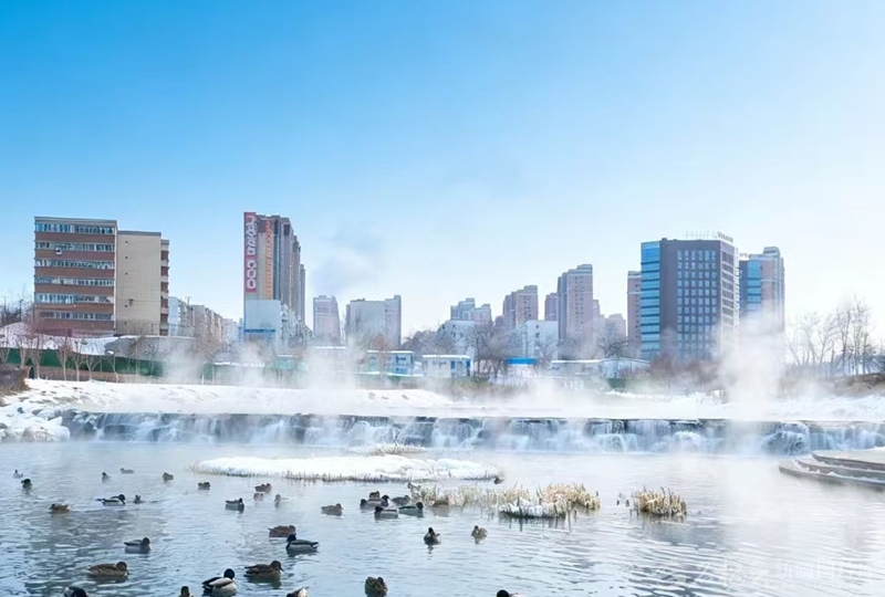 河面腾起袅袅白雾,成群结队的绿头鸭、赤麻鸭悠闲自得游弋,或贴着水面低飞,或钻入雾气里觅食,划出道道涟漪,为静谧的冬日增添着灵动;河岸上的人们打起手鼓跳起舞,跑步、打太极,呼出的白气与河雾融为一体……