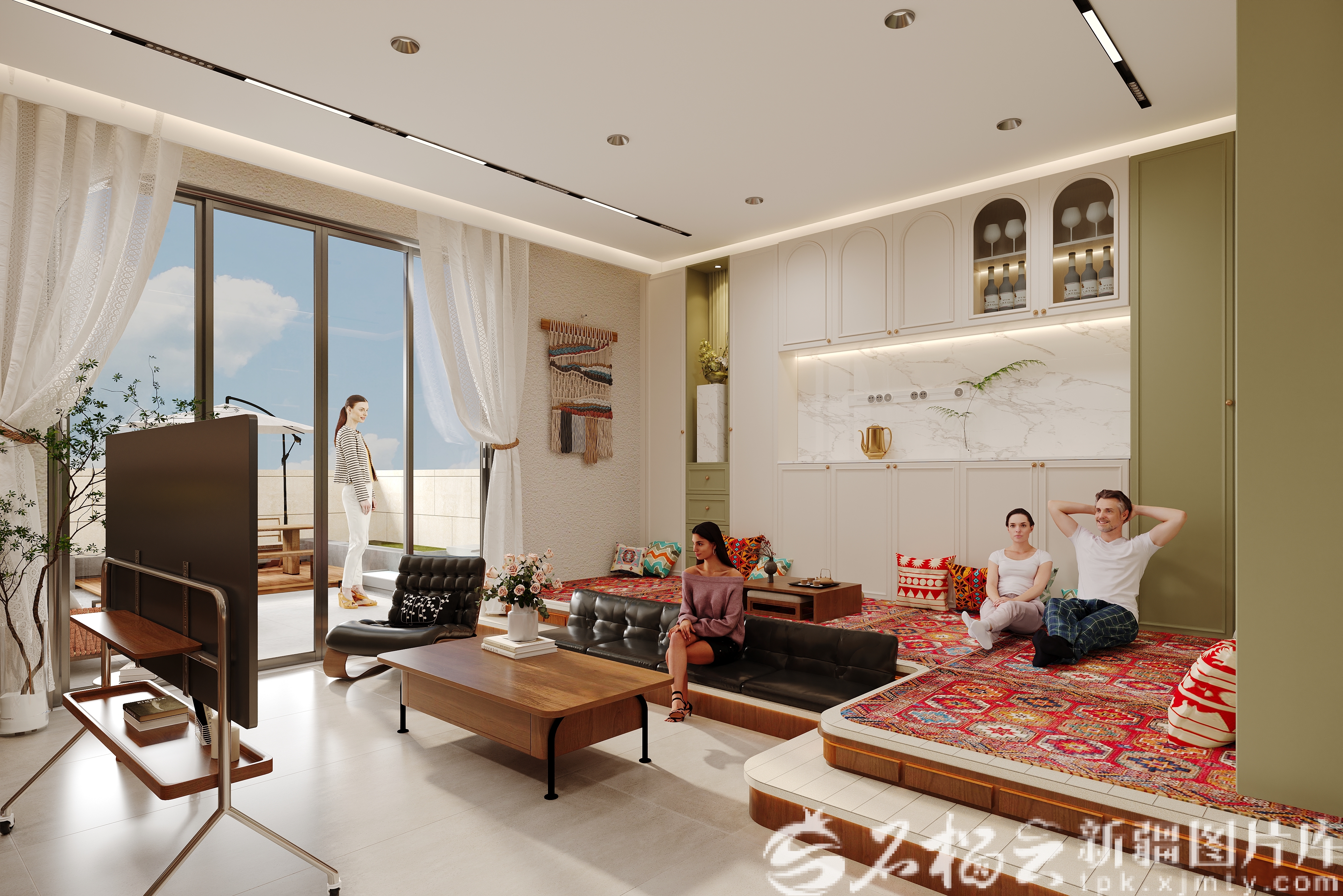 方案以维吾尔族建筑文化为根脉,将传统“阿以旺厅”创新演绎为核心互动空间,兼顾亲友聚会与多代共居的分时段使用需求,延续高台民居特点。针对喀什风沙大、温差显著的气候特点,搭配定制新风预处理系统过滤沙尘并加湿,采用钢筋混凝土夹芯保温系统实现高效节能。同时,立体庭院还原葡萄架等传统场景,升级土炕适配现代生活需求,双厨设计兼顾民族烹饪与现代社交。