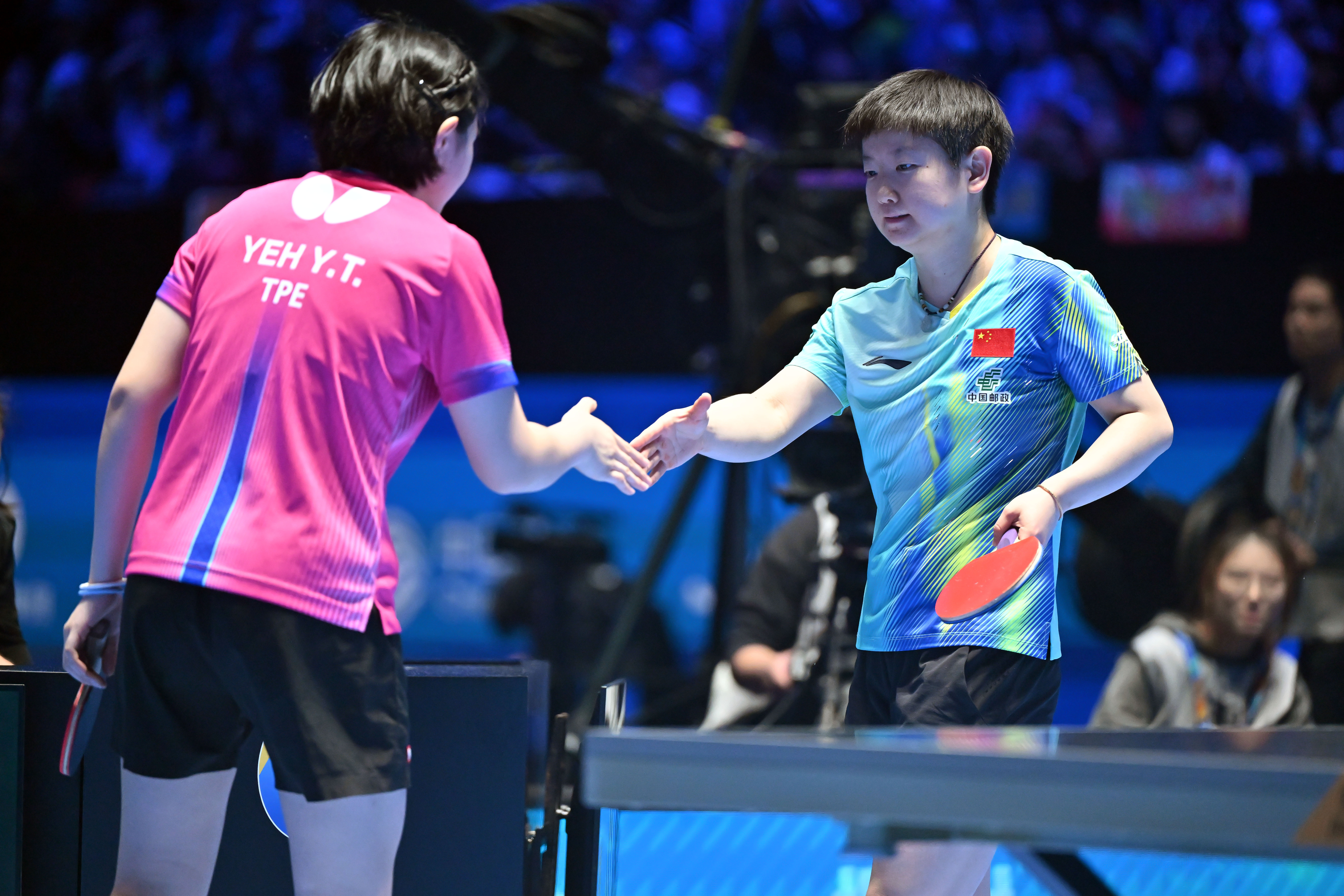 2月4日,孙颖莎(右)在比赛后与叶伊恬握手。新华社记者 郭程 摄