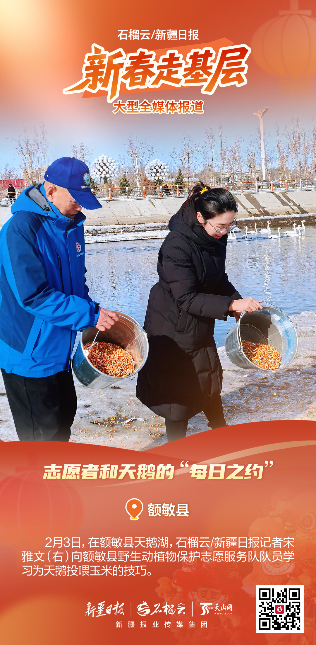 新春走基层丨海报:志愿者和天鹅的“每日之约”