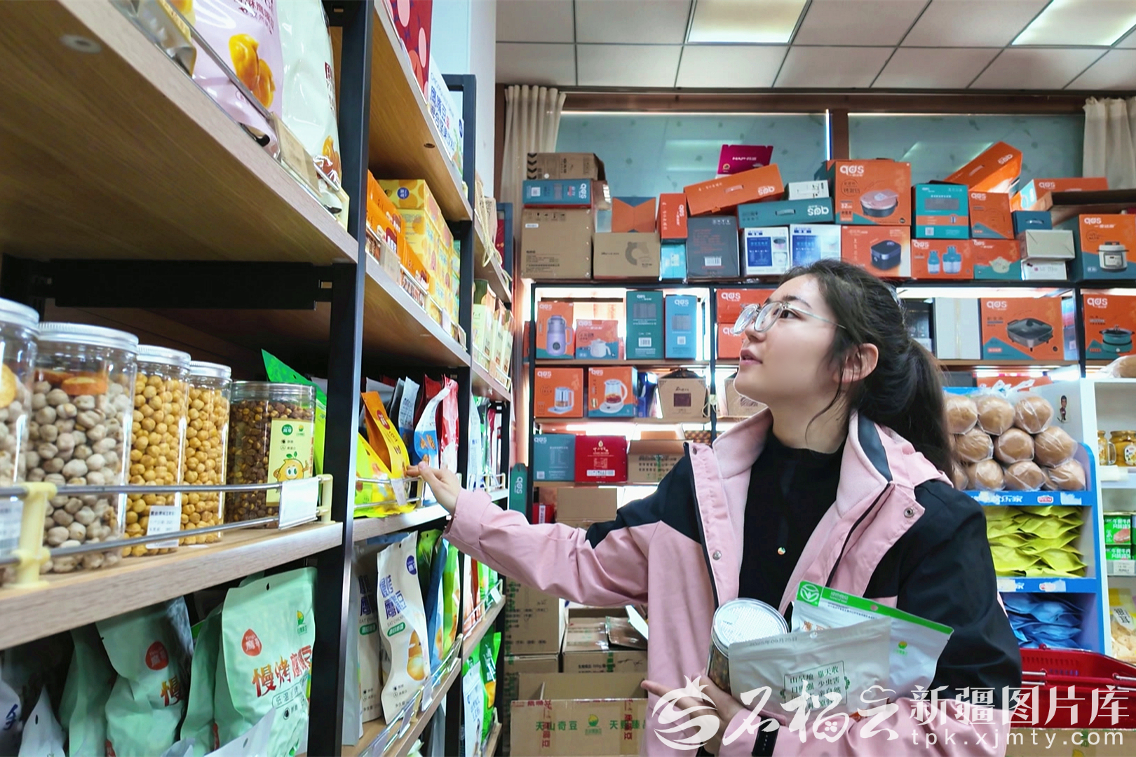 在木垒县鹰哥特产超市里,消费者正在选购鹰嘴豆系列产品(资料图)。石倩摄