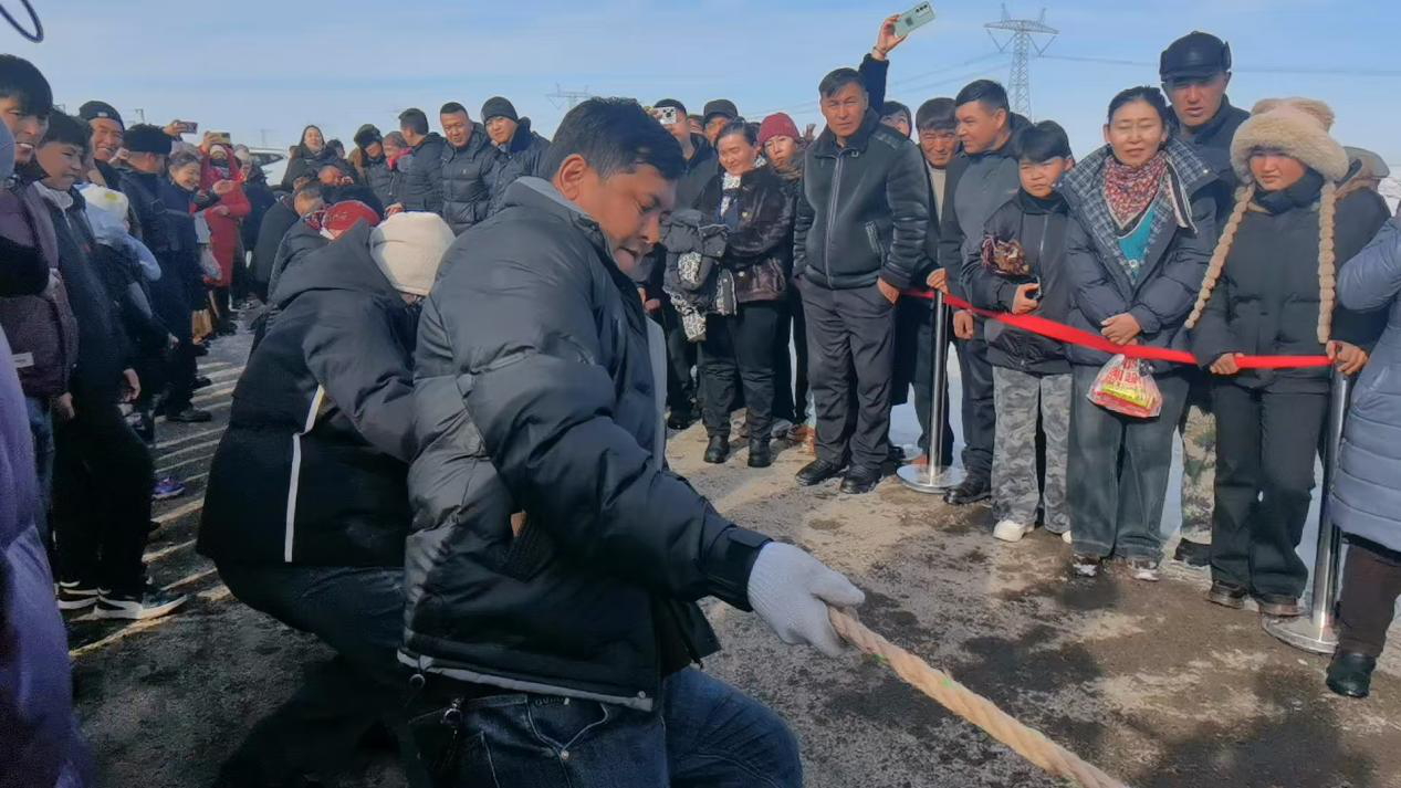11时,雪地足球、雪地拔河、单人跳绳、多人跳大绳、雪球打靶、雪地保龄球等趣味运动同步展开。村民们互相协作、互相竞争,在雪地里构成了一道充满活力的风景线。趣味项目“押架”“抓羊”等比赛更是将气氛推向高潮,这些融合了传统民俗的趣味竞技游戏,也不断释放着独特的文化魅力。周围观赛的村民们也纷纷加油呐喊,掏出手机记录下了比赛中一幕幕热闹的瞬间。
