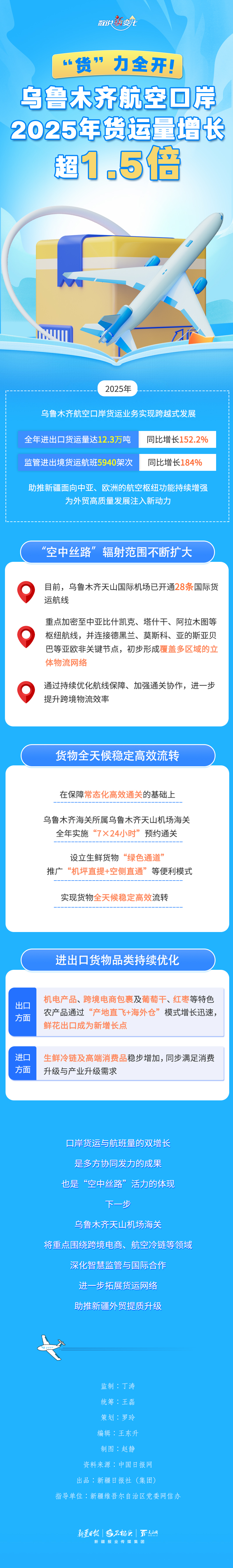 A+ A. A-2025年,乌鲁木齐航空口岸货运业务实现跨越式发展。据统计,全年进出口货运量达12.3万吨,同比增长152.2%;监管进出境货运航班5940架次,同比增长184%。优异成绩的背后,离不开各方的协同努力与创新实践。本期《数说“新”变化》带您探寻数据背后都有哪些关键举措。