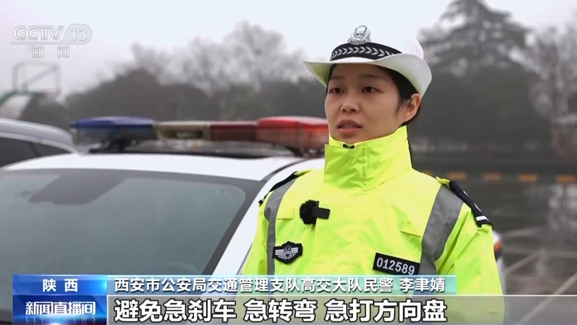 西安市公安局交通管理支队高交大队民警 李聿婧:对于冬季容易出现的暗冰现象,要提前做好预判,尤其是要注意桥梁、高架、隧道的出入口以及背阴路段,驾驶人要提前做好减速,保持匀速直线通过,避免急刹车、急转弯、急打方向盘。