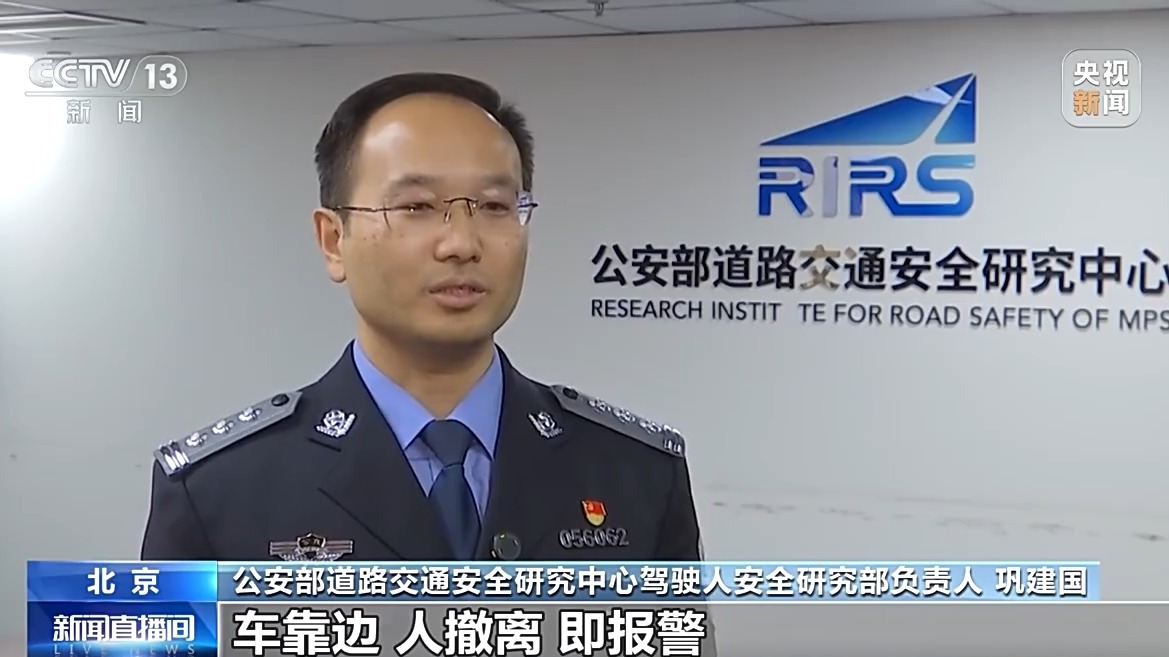 公安部道路交通安全研究中心驾驶人安全研究部负责人 巩建国:发生道路交通事故,务必记住九字诀:车靠边、人撤离、即报警。尽量将车辆移至不妨碍交通的路边,开启危险报警闪光灯,车内所有人员都要撤离至路边的安全地带,然后在车后来车方向的适当位置规范摆放三角警告牌。