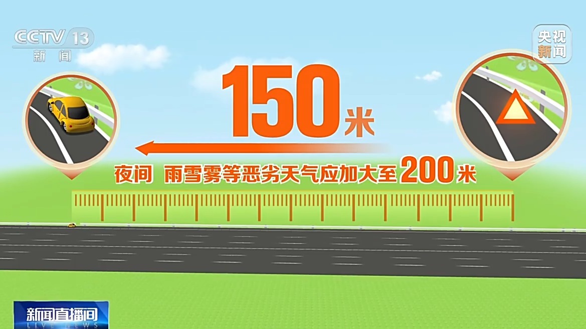 需要提醒的是,在高速公路发生事故或车辆故障,三角警告牌应摆放在来车方向150米外;如在夜间或遇雨雪雾等恶劣天气时,摆放距离应加大至200米。