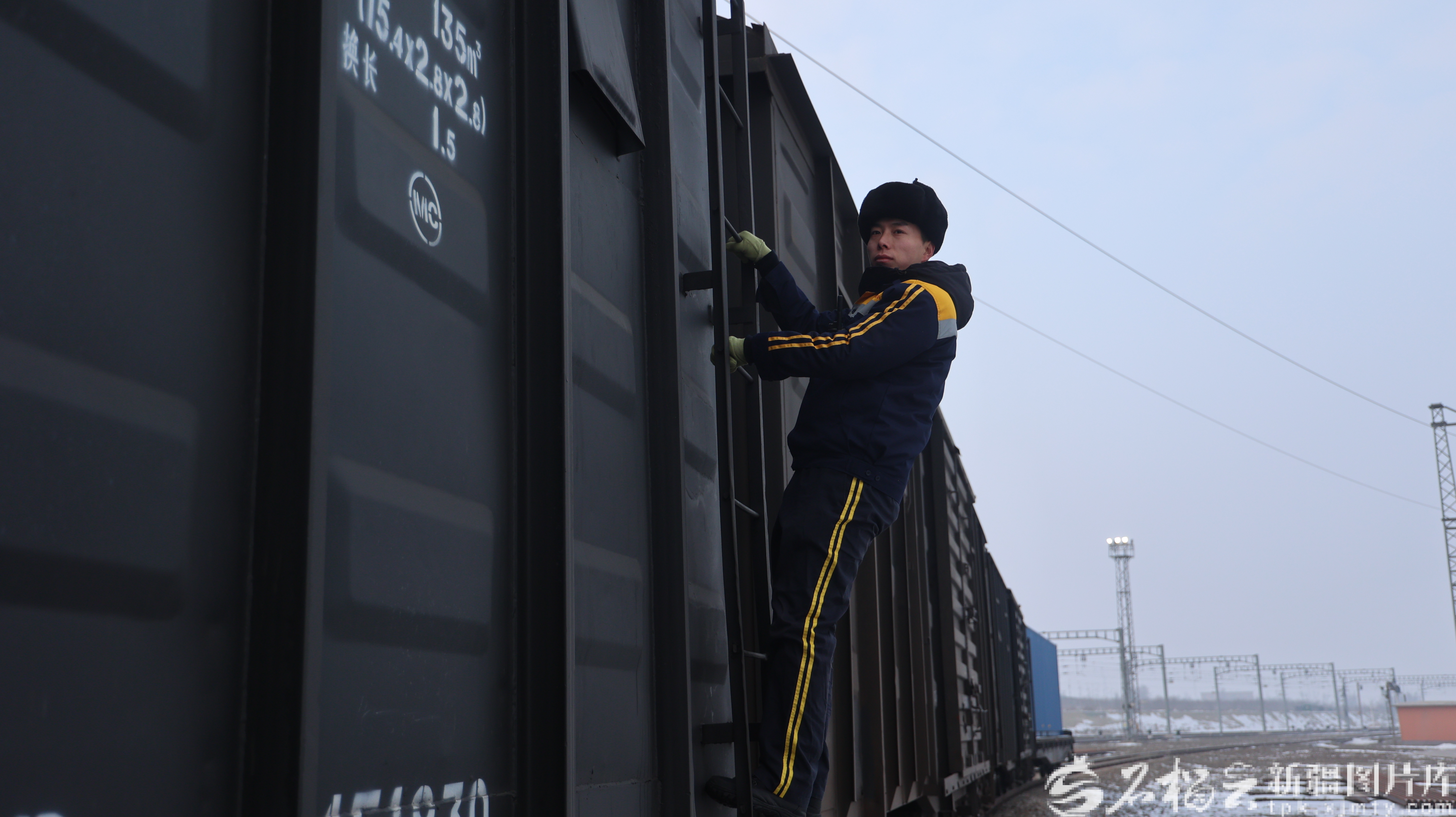 刘大盼率先爬上车梯,站在驾驶员旁的通台上,一手紧攥扶手。连结员宋震和谢恒帅用力跺脚,抖落鞋底积雪防止打滑,随即抓着车厢外侧车梯攀爬而上。宋震“挂”在车列中部,谢恒帅扒在车列尾部。
