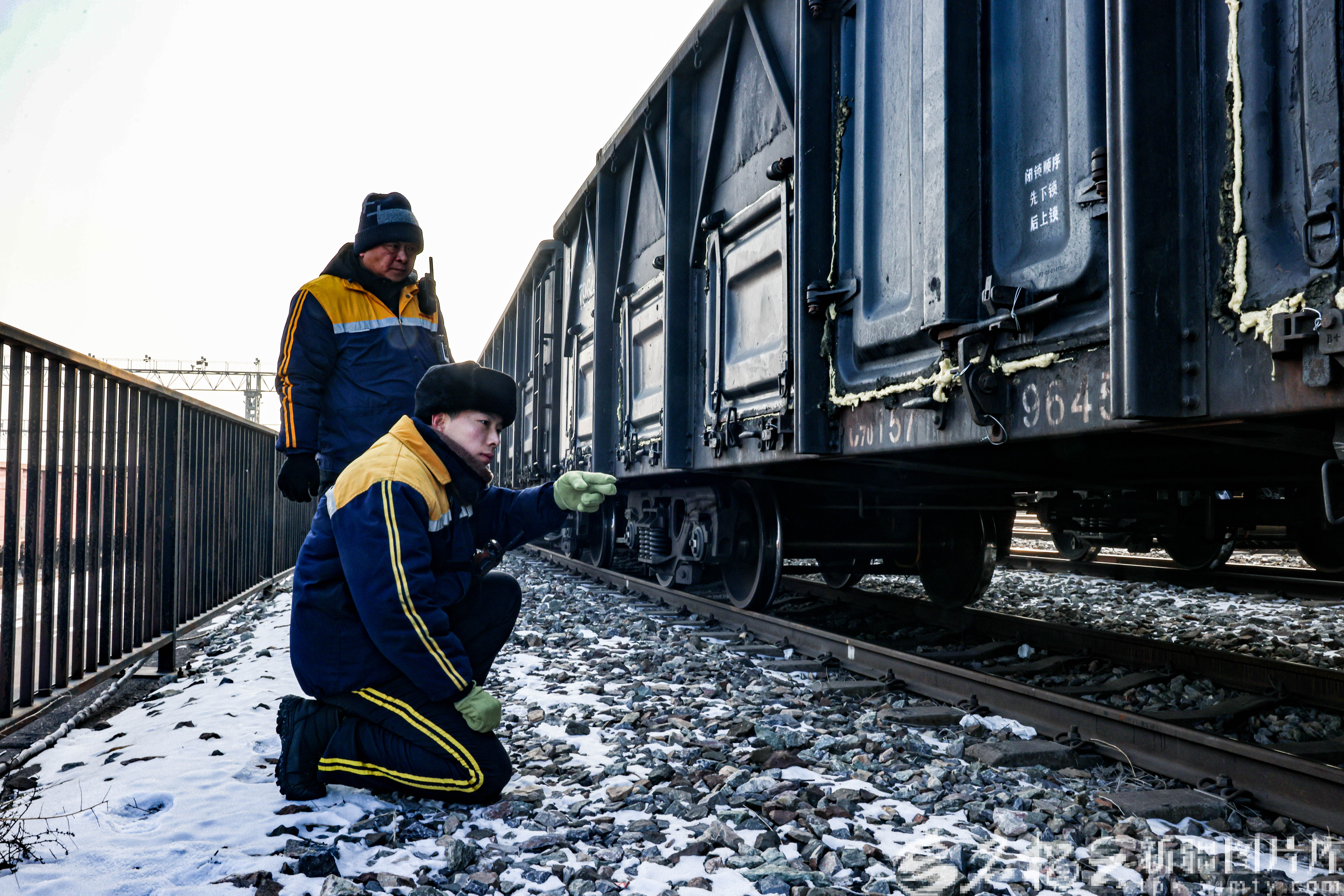 2月5日,刘大盼和宋震(右)一起检查火车的制动状态。赵越摄