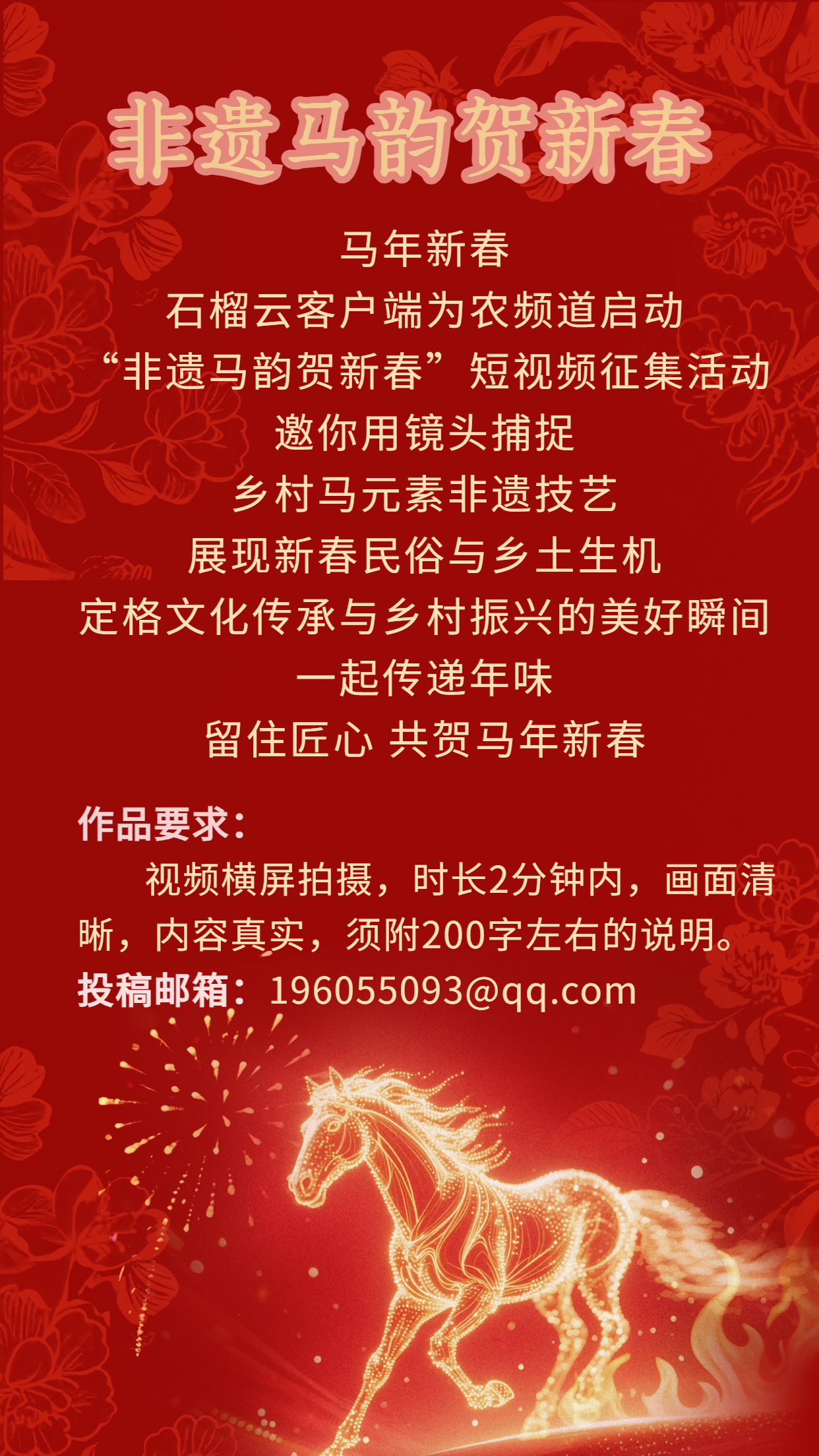 马年新春,石榴云客户端为农频道推出“非遗马韵贺新春”短视频征集活动!邀你用镜头捕捉乡村马元素非遗技艺,展现新春民俗与乡土生机,定格文化传承与乡村振兴的美好瞬间,一起传递年味、留住匠心、共贺马年新春!