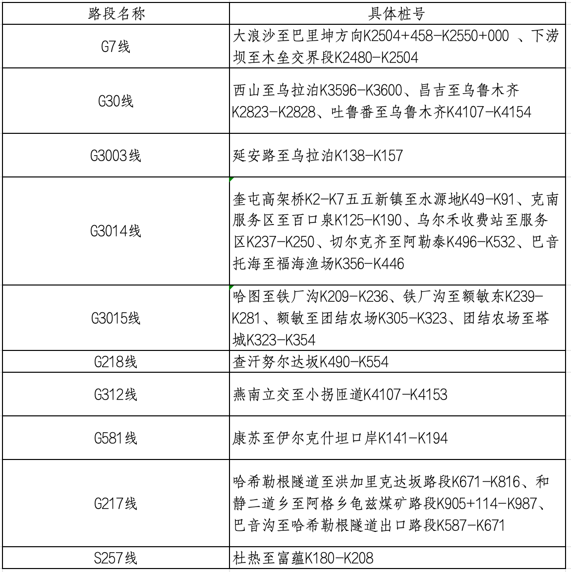 G3012线羊塔克库都克服务区、三岔口服务区、阿恰服务区、阳霞服务区库车服务区、西克尔服务区、新和服务区、佳木服务区