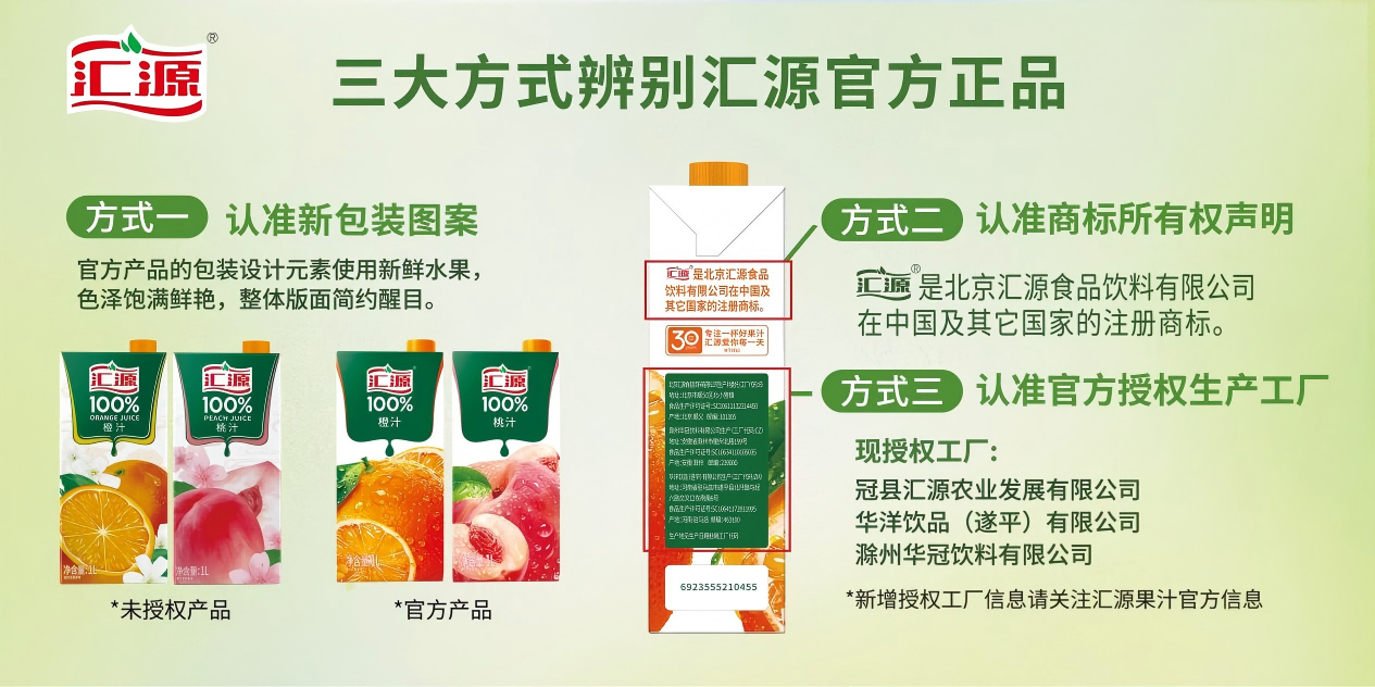 北京汇源提醒消费者,未经授权或者侵权假冒的产品,其口味、品质及售后服务均无法获得保障,品牌始终坚守品质底线,从原料选择到生产加工的各个环节执行严苛标准,为消费者提供天然健康的饮品选择。