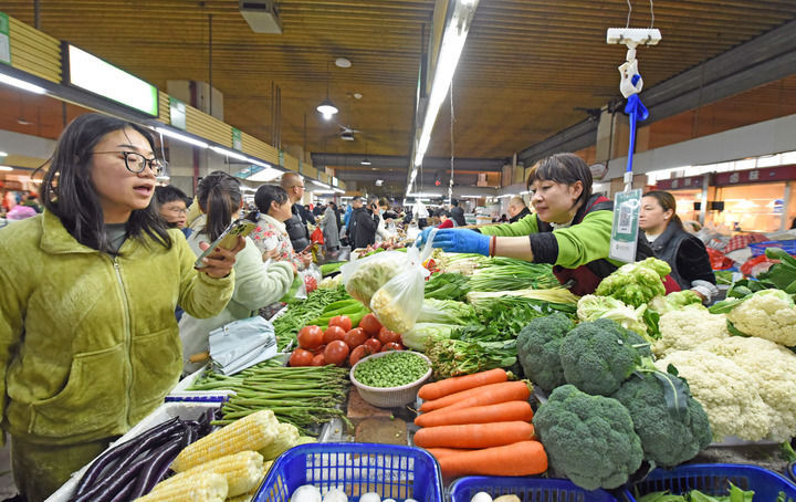 2月16日,人们在浙江省台州市仙居县中心菜场采买物资。新华社发(王华斌 摄)