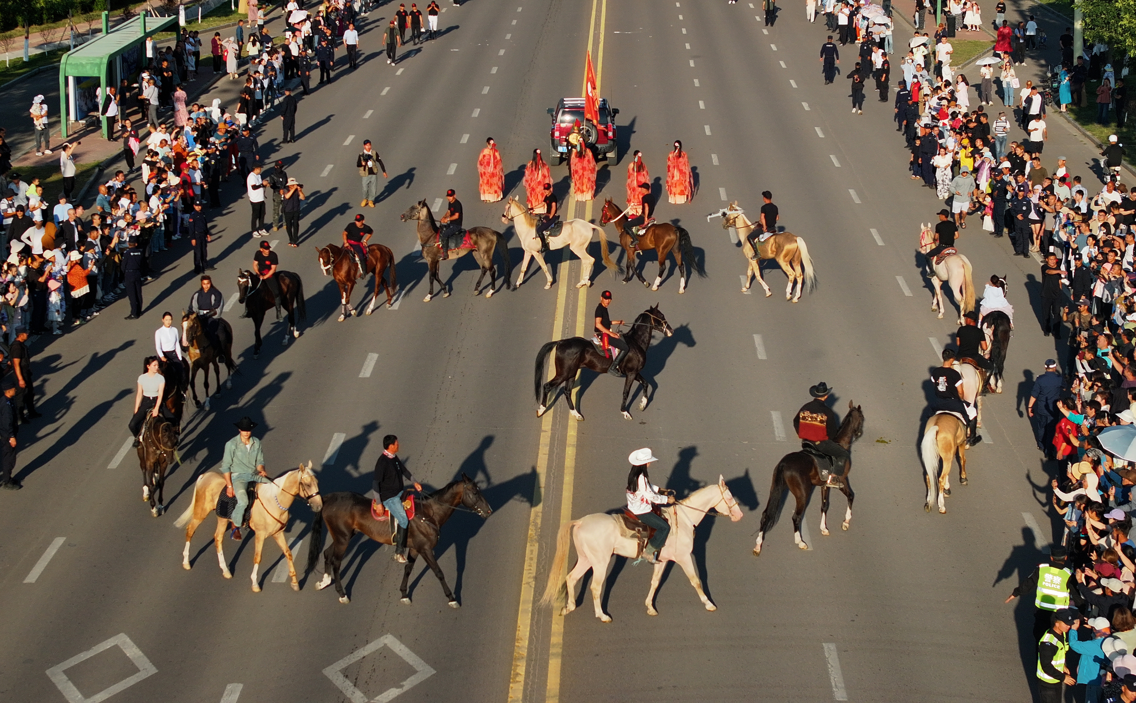 在新疆昭苏县天马大道上,骑手骑着汗血马在巡游活动中表演(2025年7月18日摄)。新华社发(张利民 摄)