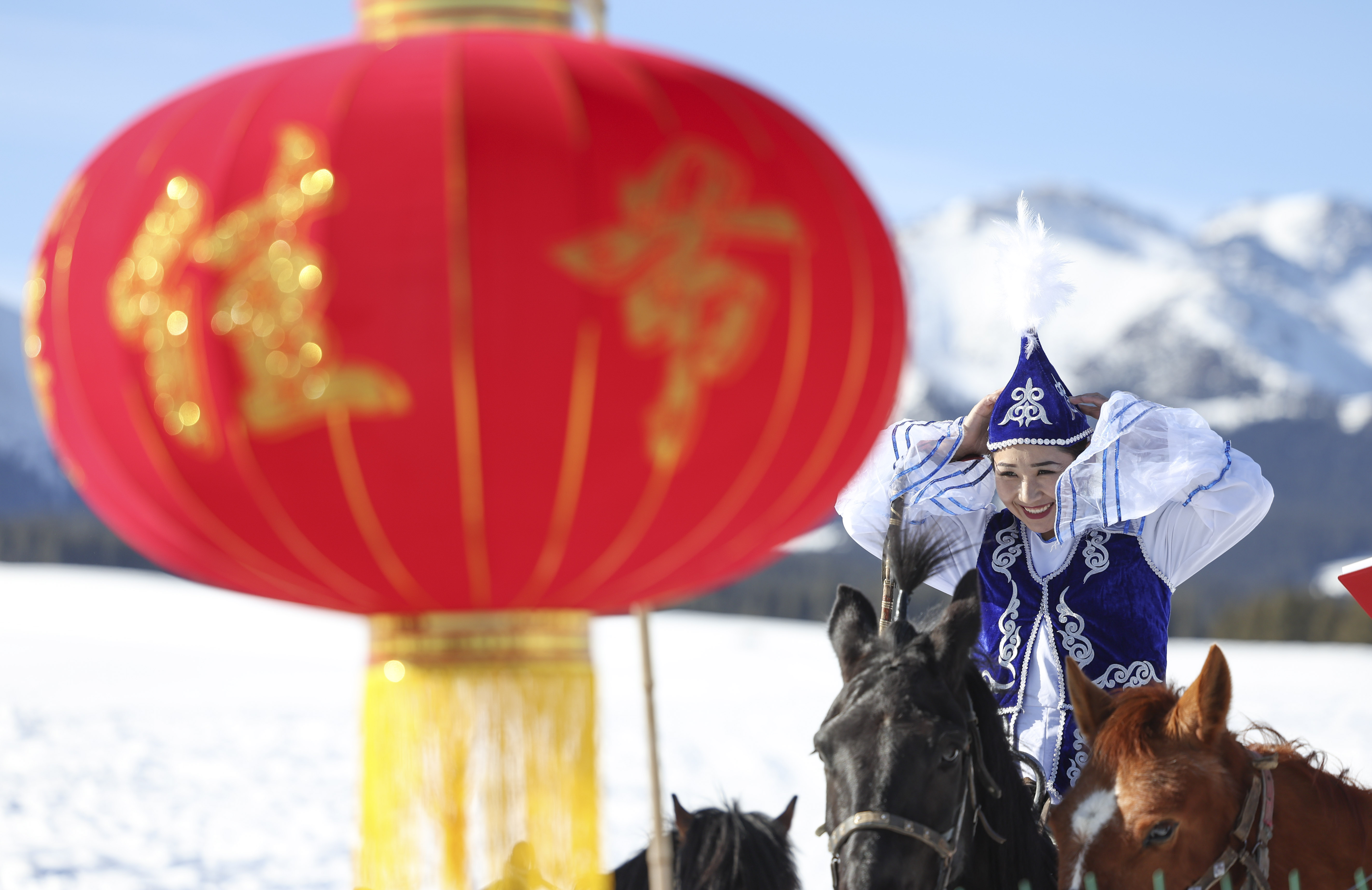 在新疆乌鲁木齐县,参与“姑娘追”比赛的村民托丽哈娜依·阿斯哈尔别克在赛前整理头饰(2024年2月11日摄)。新华社记者 胡虎虎 摄