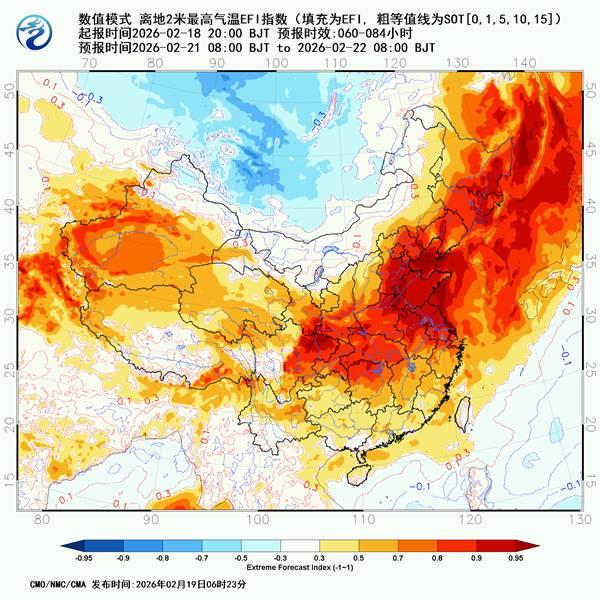 中国天气网气象分析师唐晓静介绍,从最高气温极端指数(EFI指数)来看,20—21日,甘肃东部、陕西、河南、山东等地部分地区EFI指数达到0.95以上,局地可能会打破2月下旬纪录。