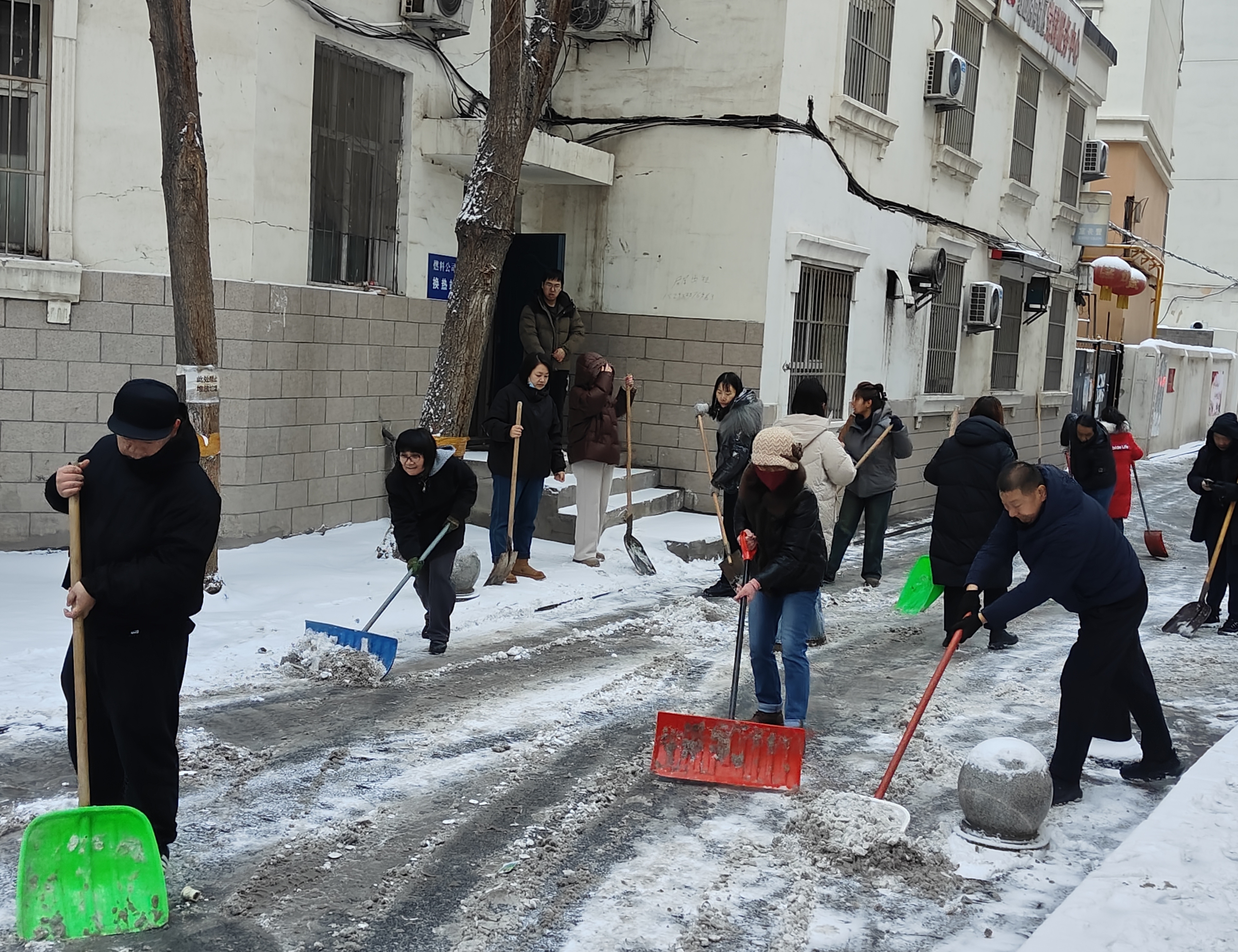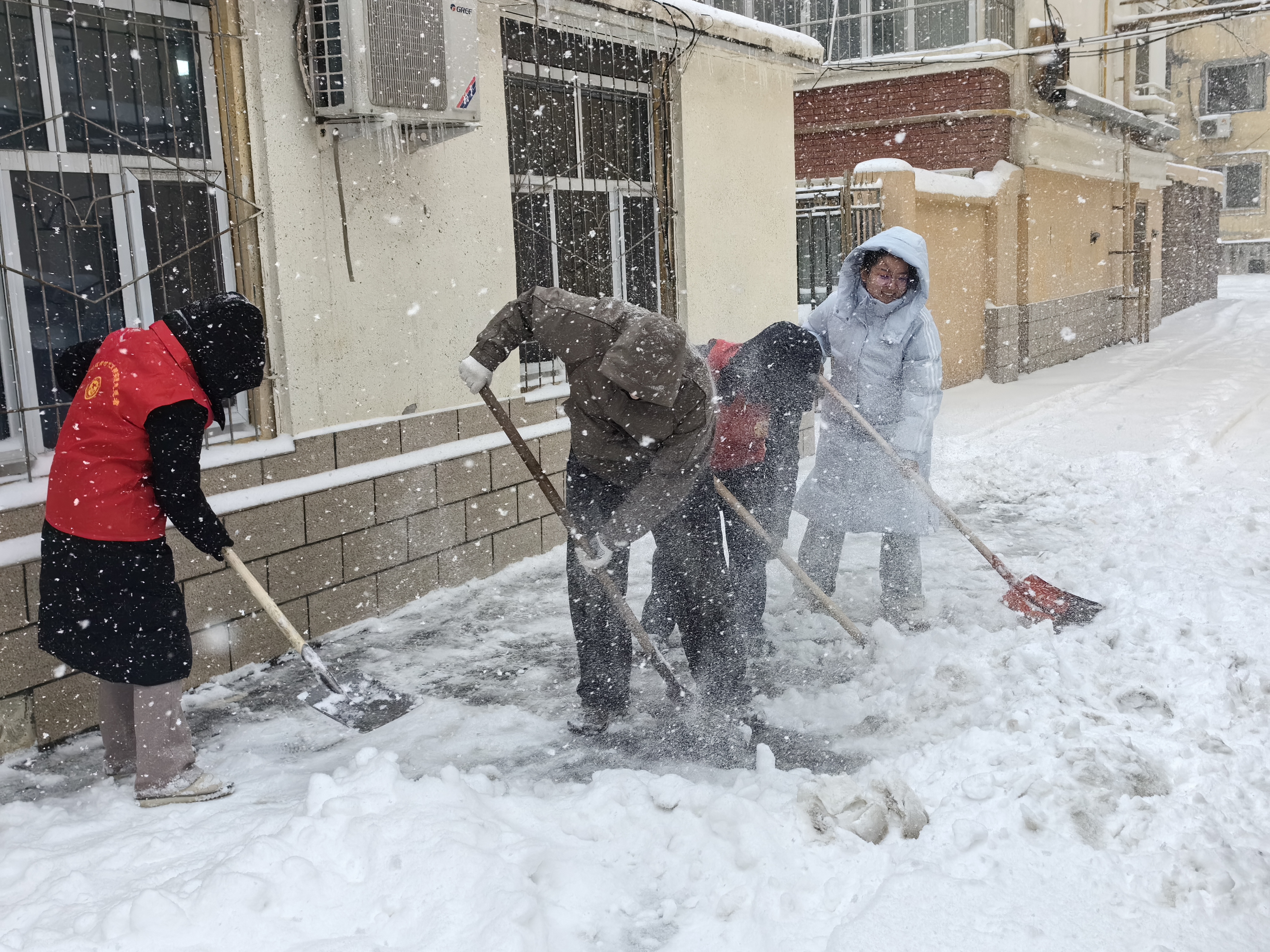 乌鲁木齐经济技术开发区(头屯河区)中亚北路街道尚北社区第一时间组织工作人员、志愿者前往辖区无物业小区开展清雪除冰行动。对小区主干道、单元门口、人行坡道等重点区域逐一清扫,切实守护辖区居民平安出行。
