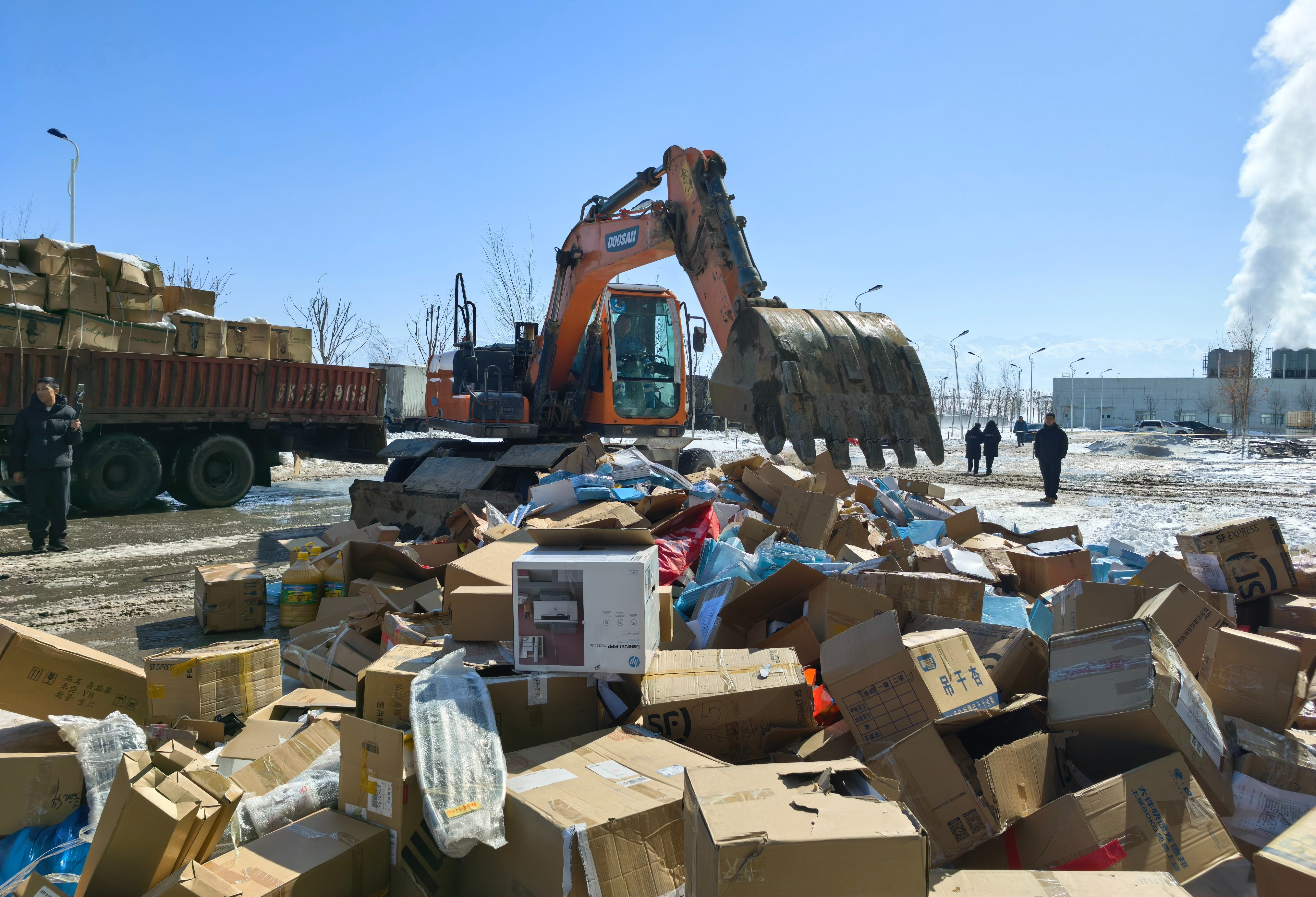销毁现场,市场监管部门工作人员搬运待销毁的物品。石榴云/新疆法治报记者 龚彦晨摄
