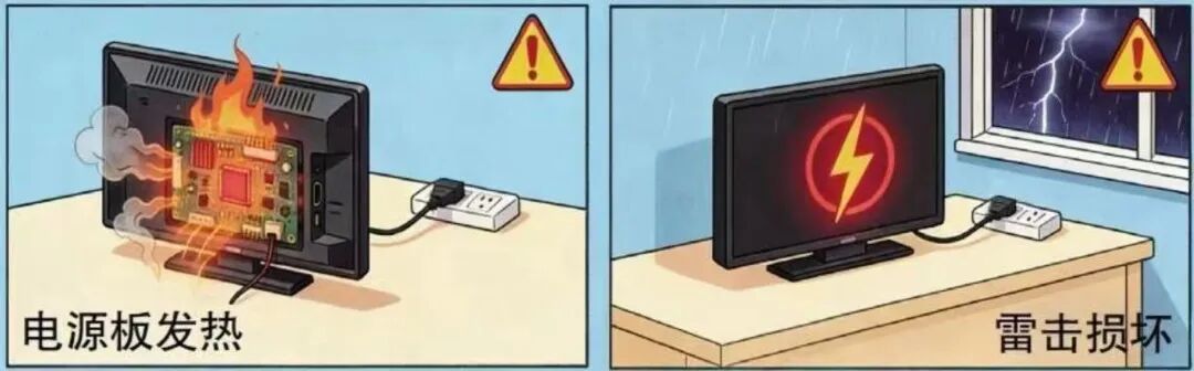 雷电可能通过电源线击穿电视机内部元件,造成设备损坏,甚至引发触电危险。