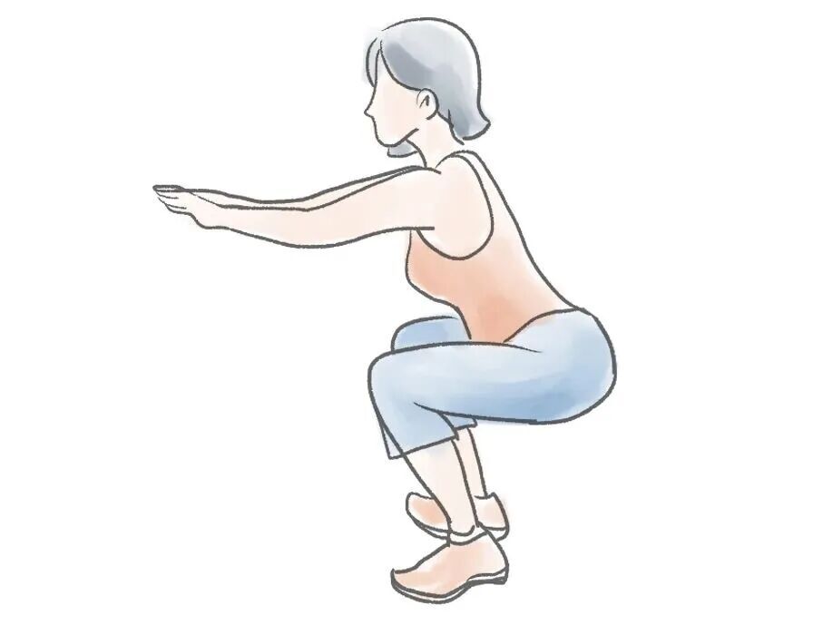 动作要点:背靠墙,双脚与肩同宽,脚尖朝前。缓慢沿墙下滑至感到大腿酸胀乏力(初学者可蹲至大腿与地面呈120°),保持小腿垂直于地面,膝盖勿内扣。蹲姿深度以不引发膝关节疼痛为前提。重心放在脚后跟。保持30~60秒/次,5~10次/组,每日2~3组。