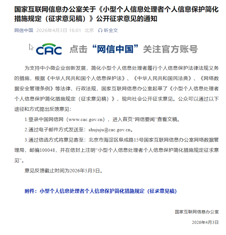 为支持中小微企业创新发展,简化小型个人信息处理者履行个人信息保护法律法规义务的措施,根据《中华人民共和国个人信息保护法》、《中华人民共和国民法典》、《网络数据安全管理条例》等法律、行政法规,国家互联网信息办公室起草了《小型个人信息处理者个人信息保护简化措施规定(征求意见稿)》,现向社会公开征求意见。公众可以通过以下途径和方式提出反馈意见: