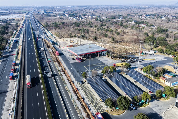 G50沪渝高速长兴服务区内的太阳能光伏板下是升级完成的高速服务区充电站(2026年1月7日摄,无人机照片)。新华社记者 徐昱 摄