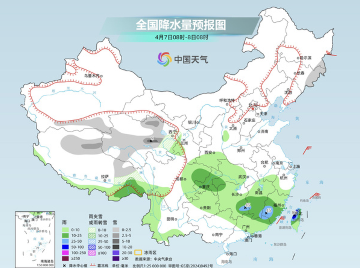 4月7日8时—8日8时全国降水量预报图。图片来源/天气网