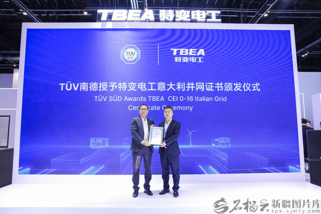 特变电工西安电气科技有限公司自主研发的TE215K-HV组串式储能变流器,连续获得欧洲两项权威认证。图为意大利并网证书颁发仪式现场。受访单位供图