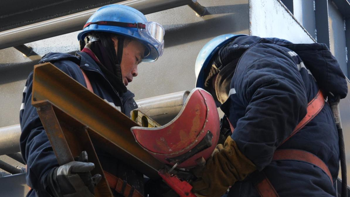 付明友(左一)与工友正在进行焊工作业。张迪摄