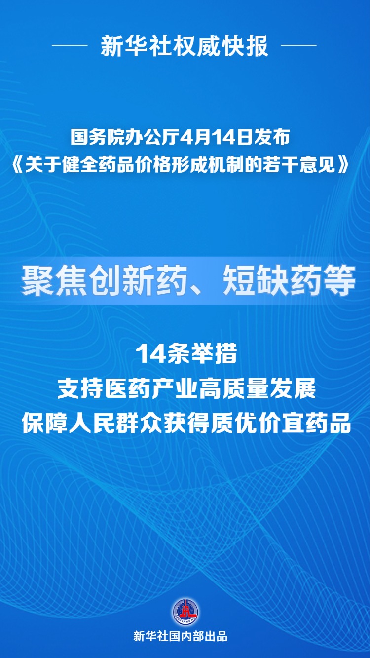 国务院办公厅4月14日发布《关于健全药品价格形成机制的若干意见》,提出14条举措,包括优化创新药等新上市药品首发价格机制、发挥医保支付标准对药品价格形成的引导作用、引导药店合理制定药品零售价格、强化短缺药保供稳价等。