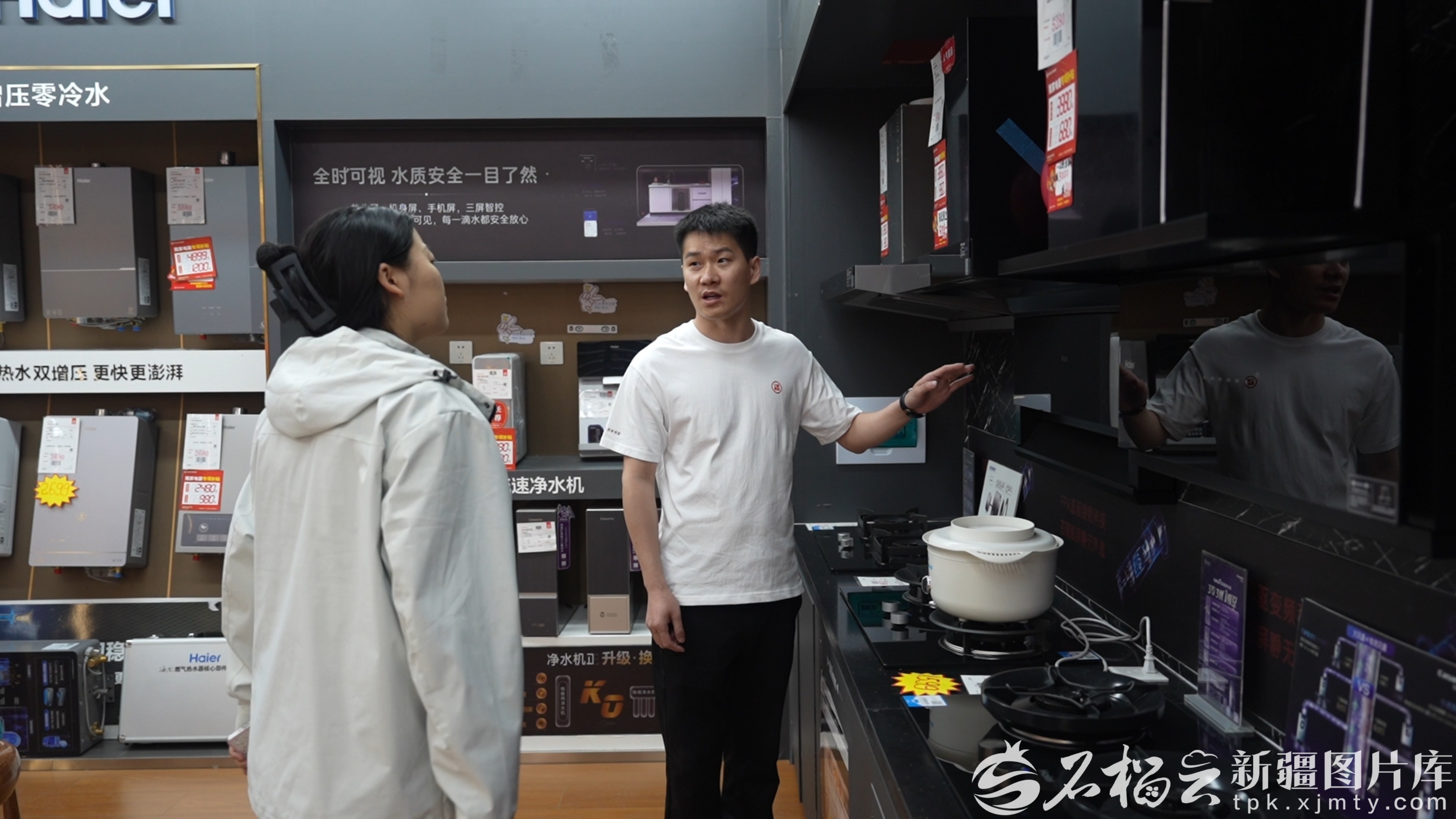 3月28日,伊宁市民在一家电器卖场内选购抽油烟机。李亚锋摄