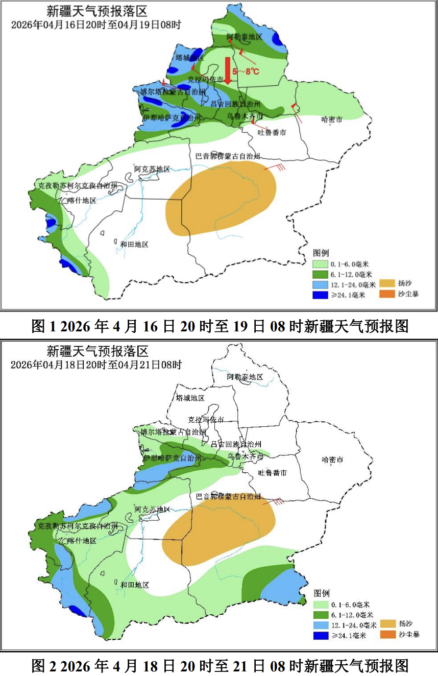 A+ A. A-石榴云/新疆日报讯(记者 谢慧变报道)记者从新疆气象台获悉:受强冷空气影响,4月17日至21日,北疆及南疆西部将先后迎来明显降水、大风沙尘及强降温天气。全疆大部气温下降5—8℃,北疆北部最低气温降至-3—-1℃,有不同程度霜冻。自治区气候中心(农业气象台)专家提示,降水降温风沙天气对棉花、小麦和玉米等作物播种和出苗生长不利,各地应合理调整春播时间,避开不利天气。