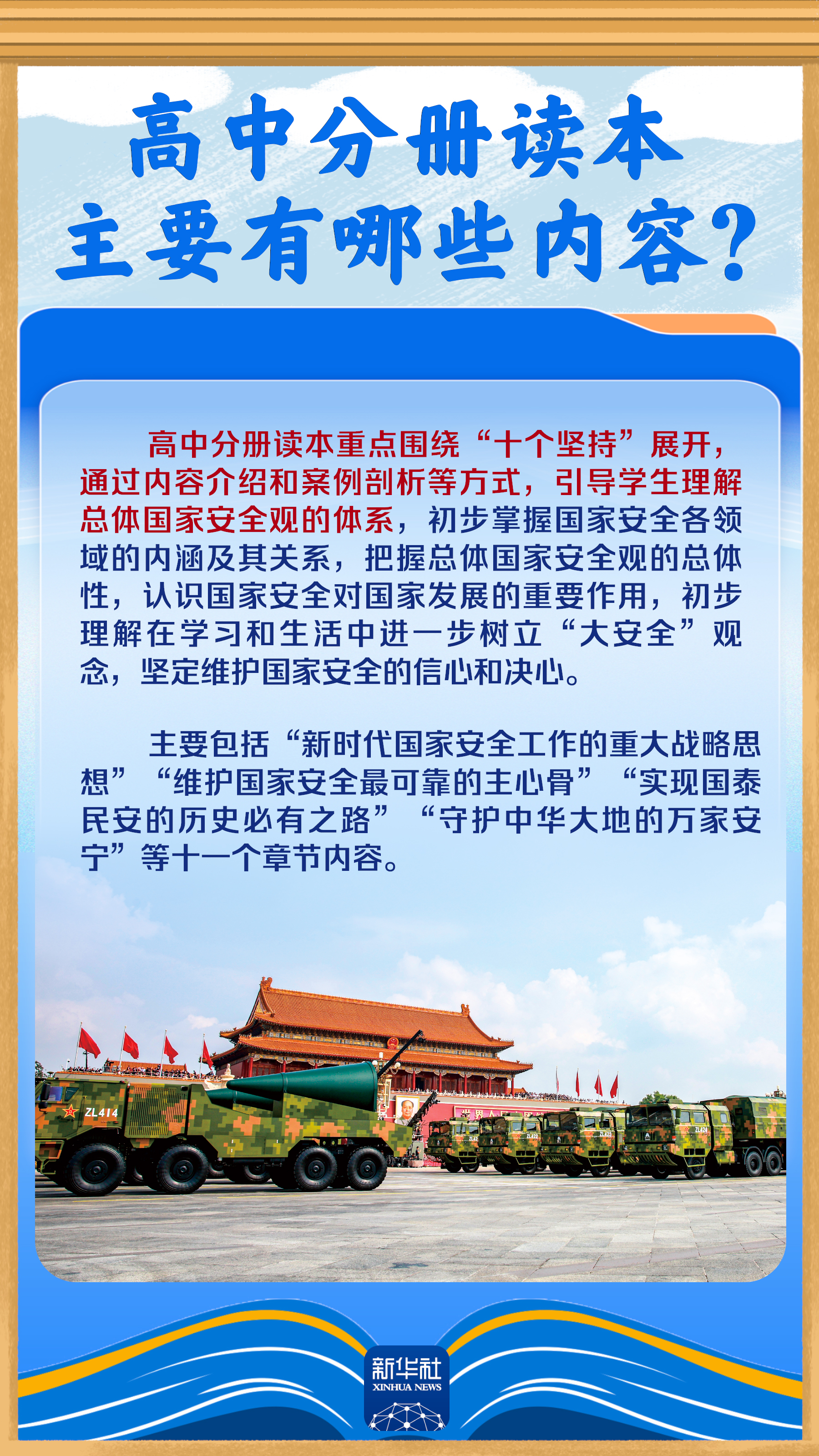 A+ A. A-今天是4月15日,第十一个全民国家安全教育日。近日,专为青少年学生编写的《国家安全教育中小学生读本》(以下简称“读本”)由人民出版社与人民教育出版社联合出版发行。这套读本包括哪些主要内容?是如何编写的?提到了哪些国家安全领域?跟随海报,一起了解。