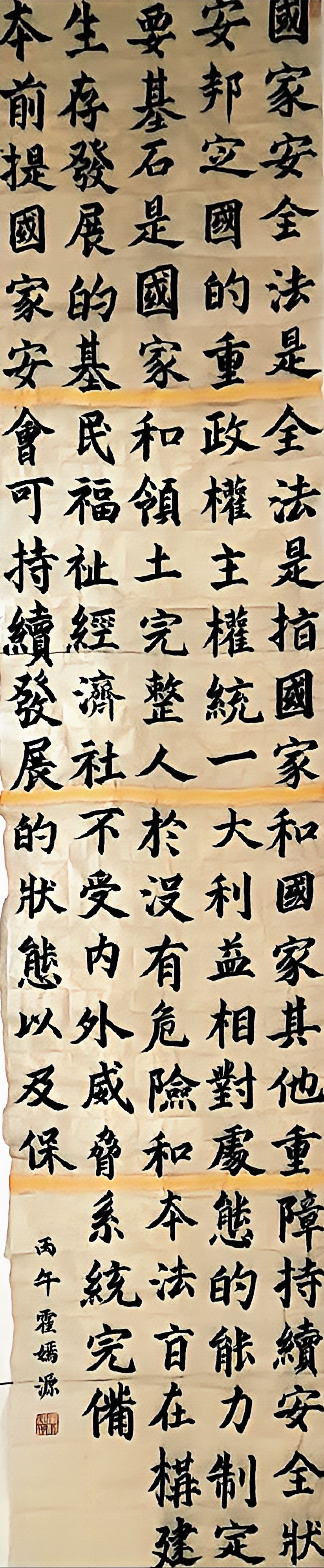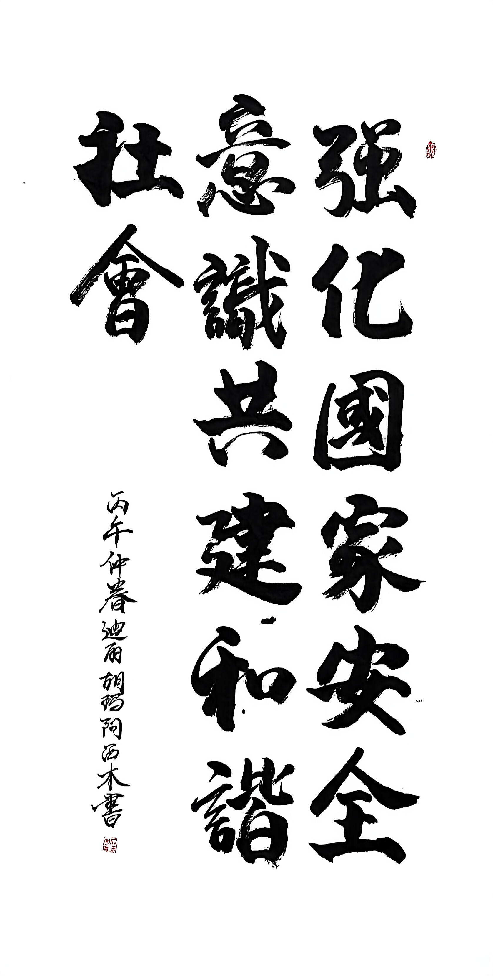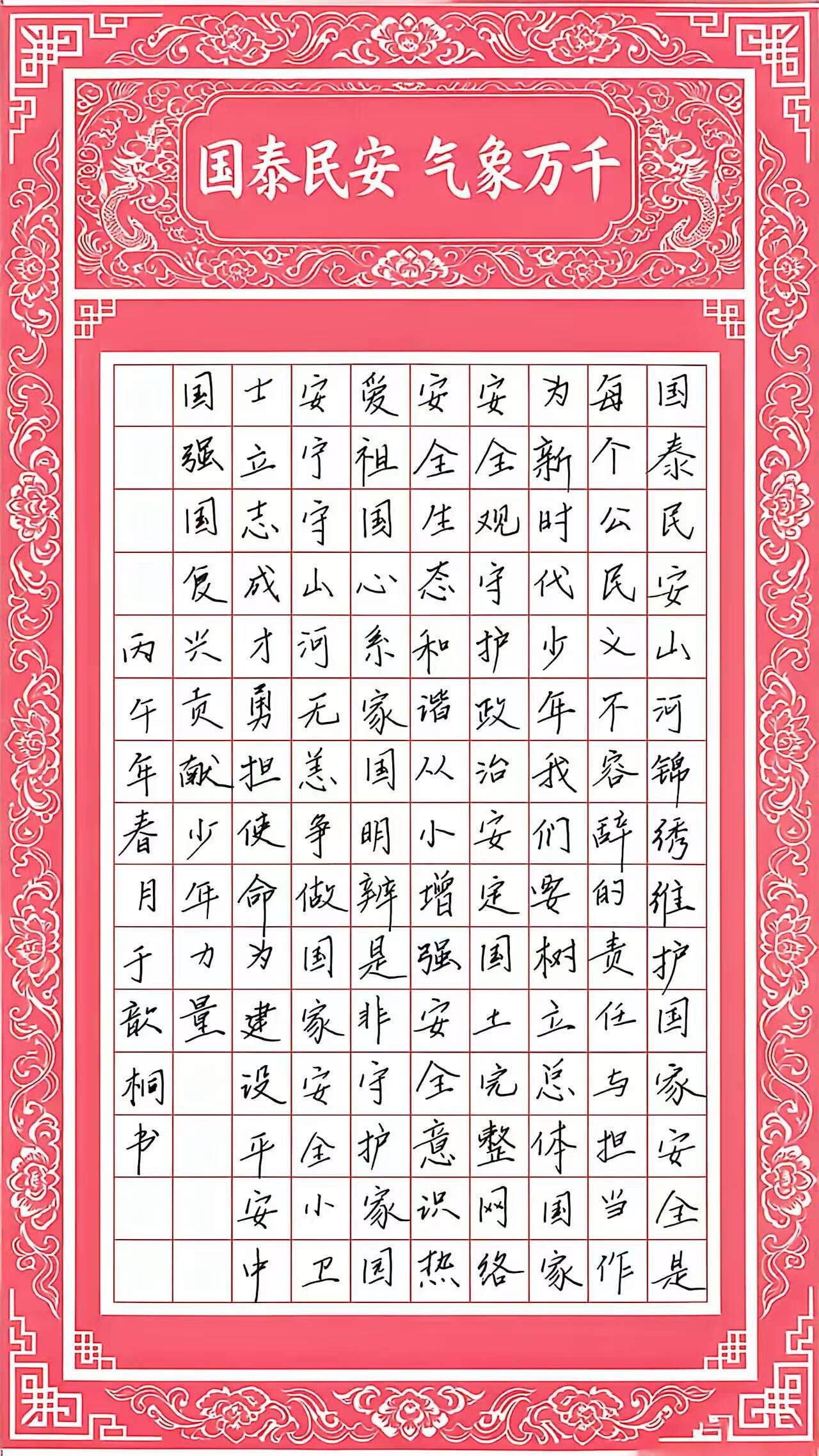 泼墨挥毫间,家国情怀跃然纸上。楷书端正厚重,行书行云流水,隶书古朴典雅——孩子们以传统书法艺术为载体,将“国家安全,人人有责”“国泰民安山河无恙”等铿锵有力的誓言落于宣纸之上,让中华优秀传统文化与国家安全理念相融共生、相得益彰。