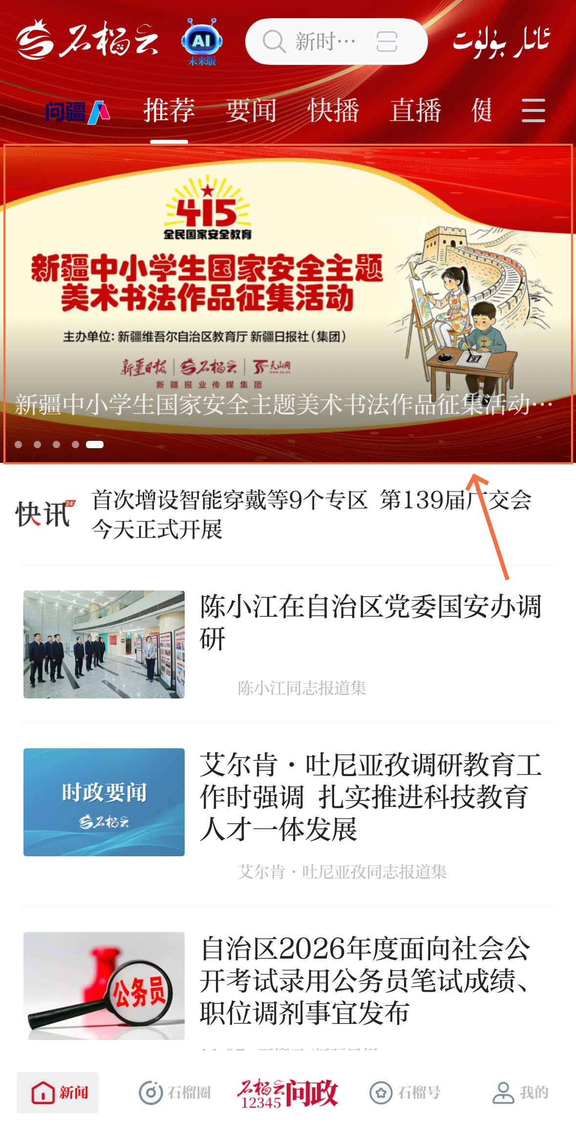 2.在石榴云客户端首页轮播图找到“新疆中小学生国家安全主题美术书法作品征集活动”专区入口,进入后选择作品类型。