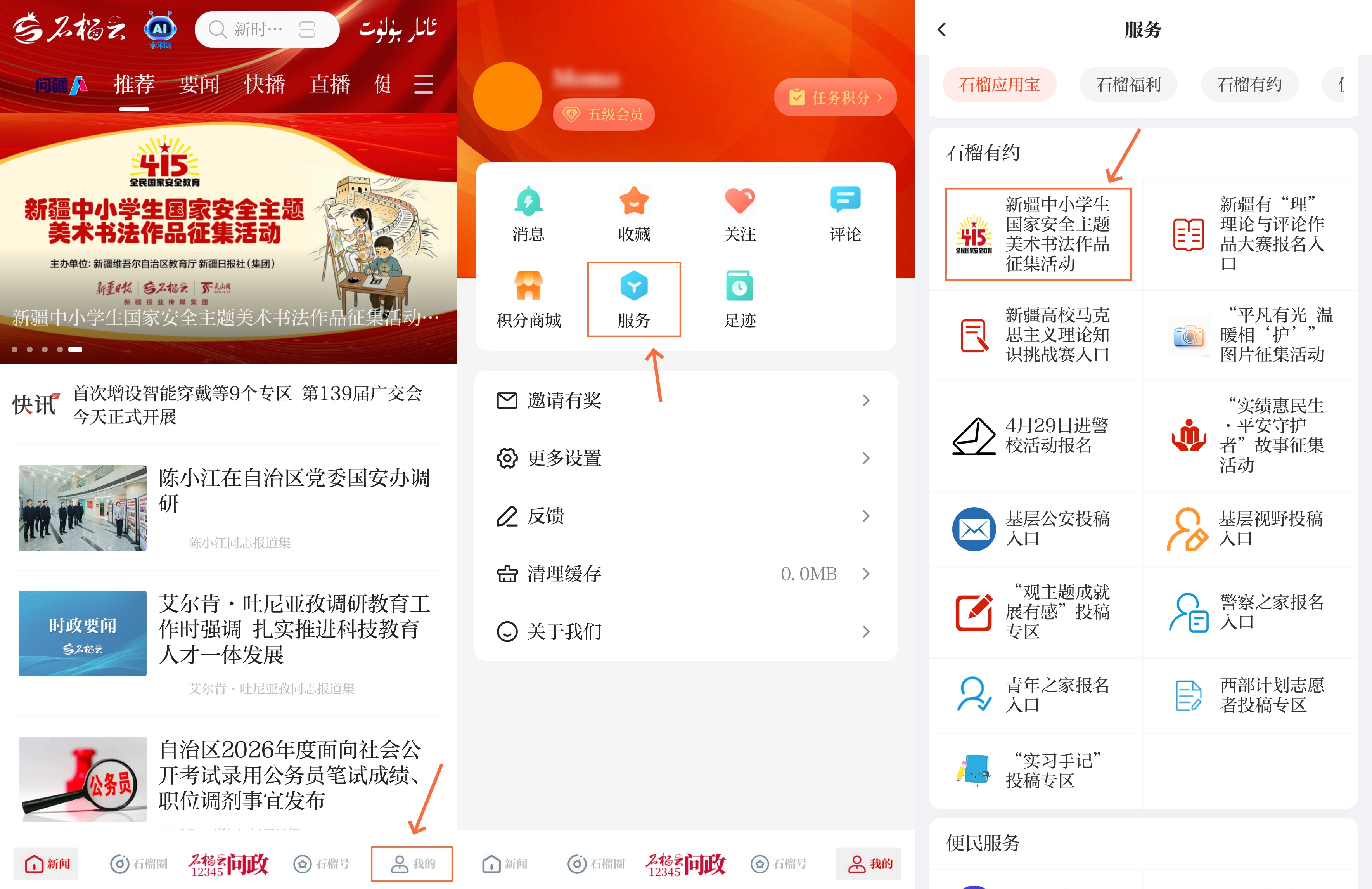 或者点击石榴云客户端右下角【我的】,进入【服务】板块,随后下拉页面,找到“新疆中小学生国家安全主题美术书法作品征集活动”专区入口。