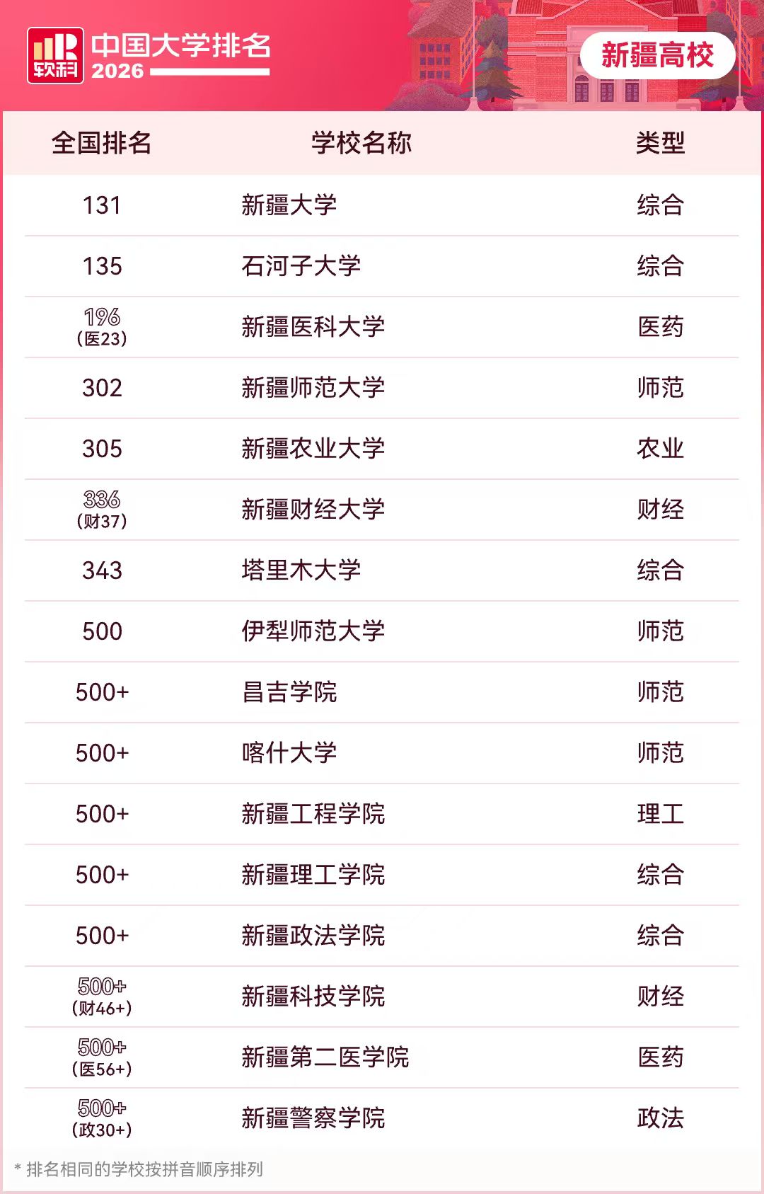 A+ A. A-石榴云/新疆日报讯(记者 赵西娅报道)4月15日,2026软科中国大学排名发布,今年新疆共有16所高校上榜,其中11所高校跻身主榜,即综合性大学排名,5所高校上榜单科性大学排名。
