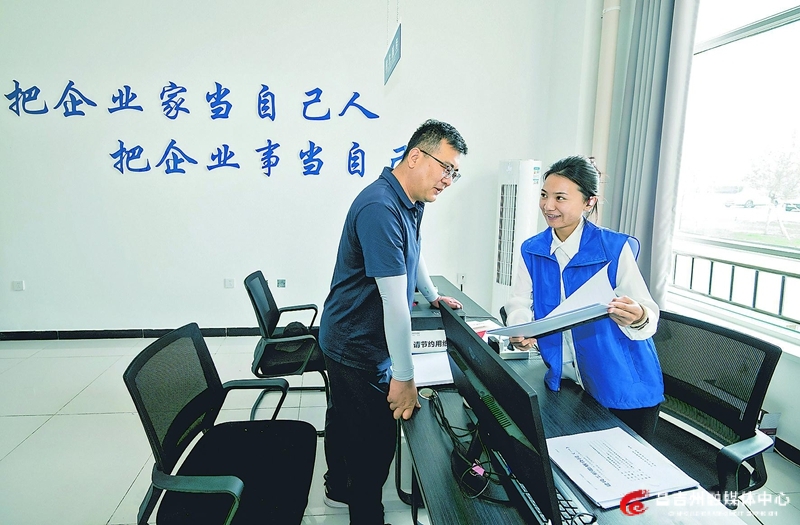 准东经济技术开发区芨芨湖新城企业服务中心企业服务大厅,工作人员在办理业务(6月18日摄)。记者何龙 摄