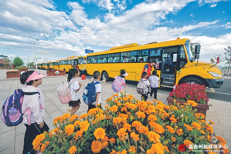 九年一贯制准东学校的学生放学后乘坐校车回家(6月27日摄)。记者何龙 摄