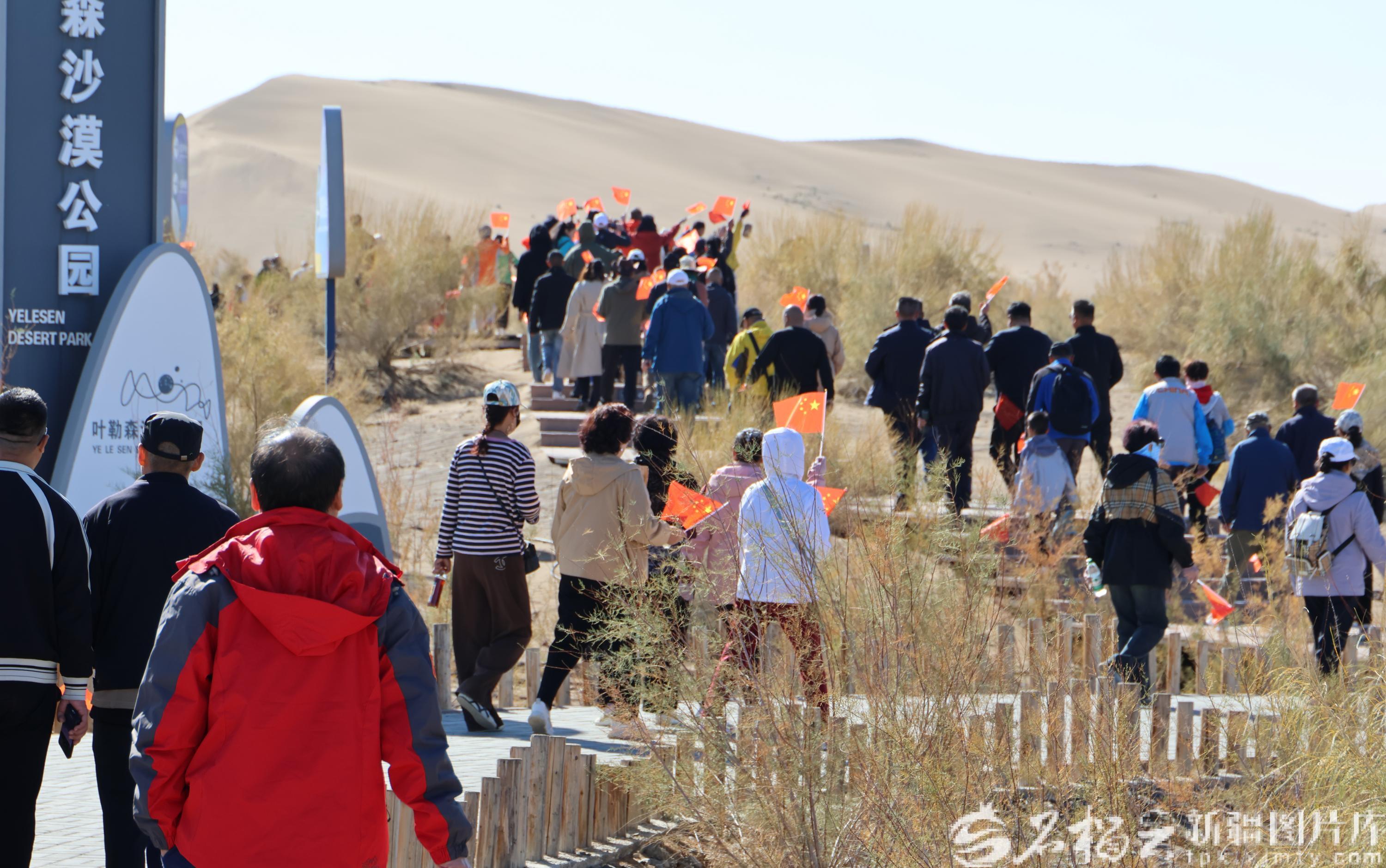 A+ A. A-10月3日,参加叶勒森沙漠休闲体育大会的游客在进行全民健步走活动。图片由木垒县融媒体中心提供