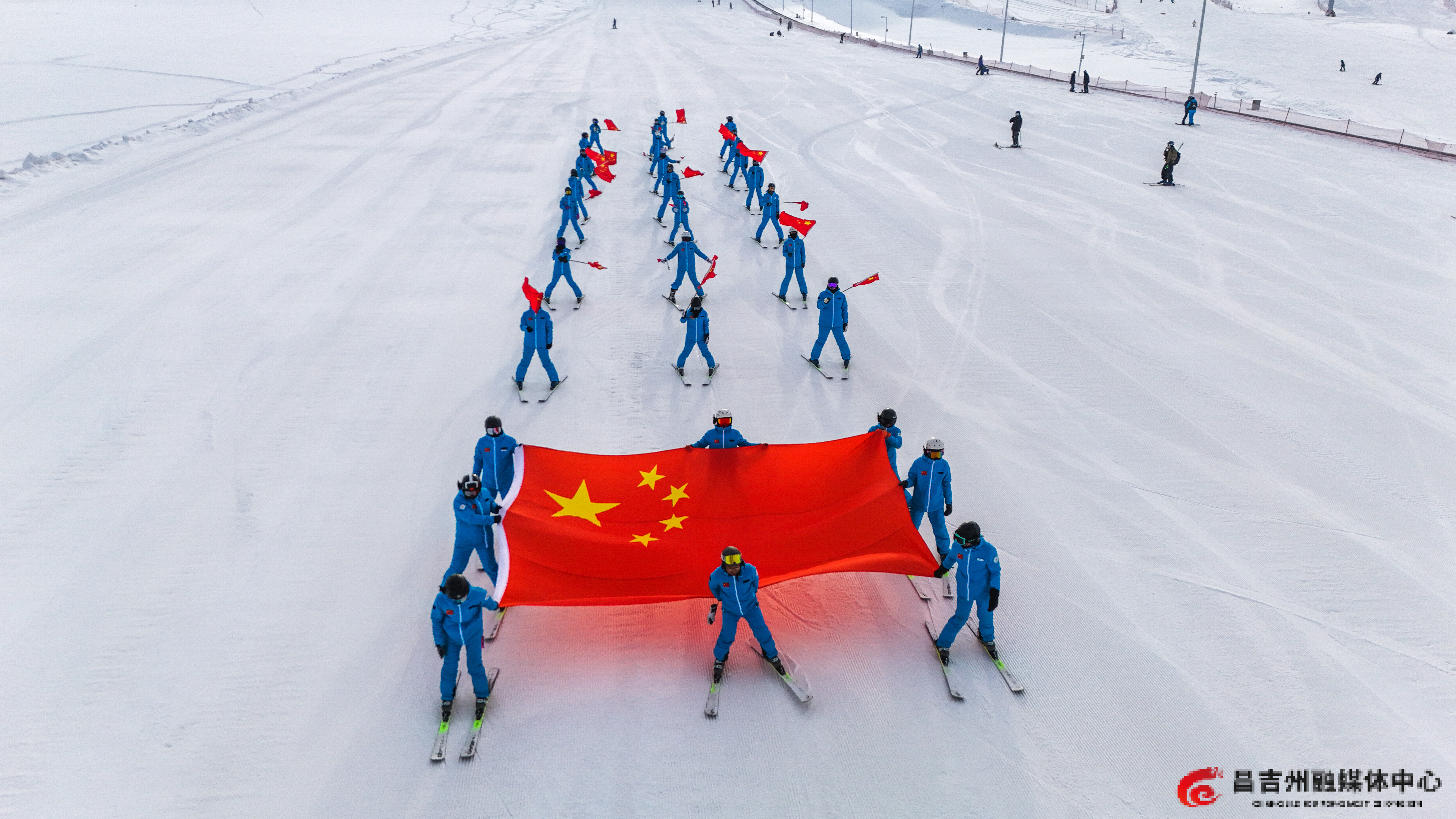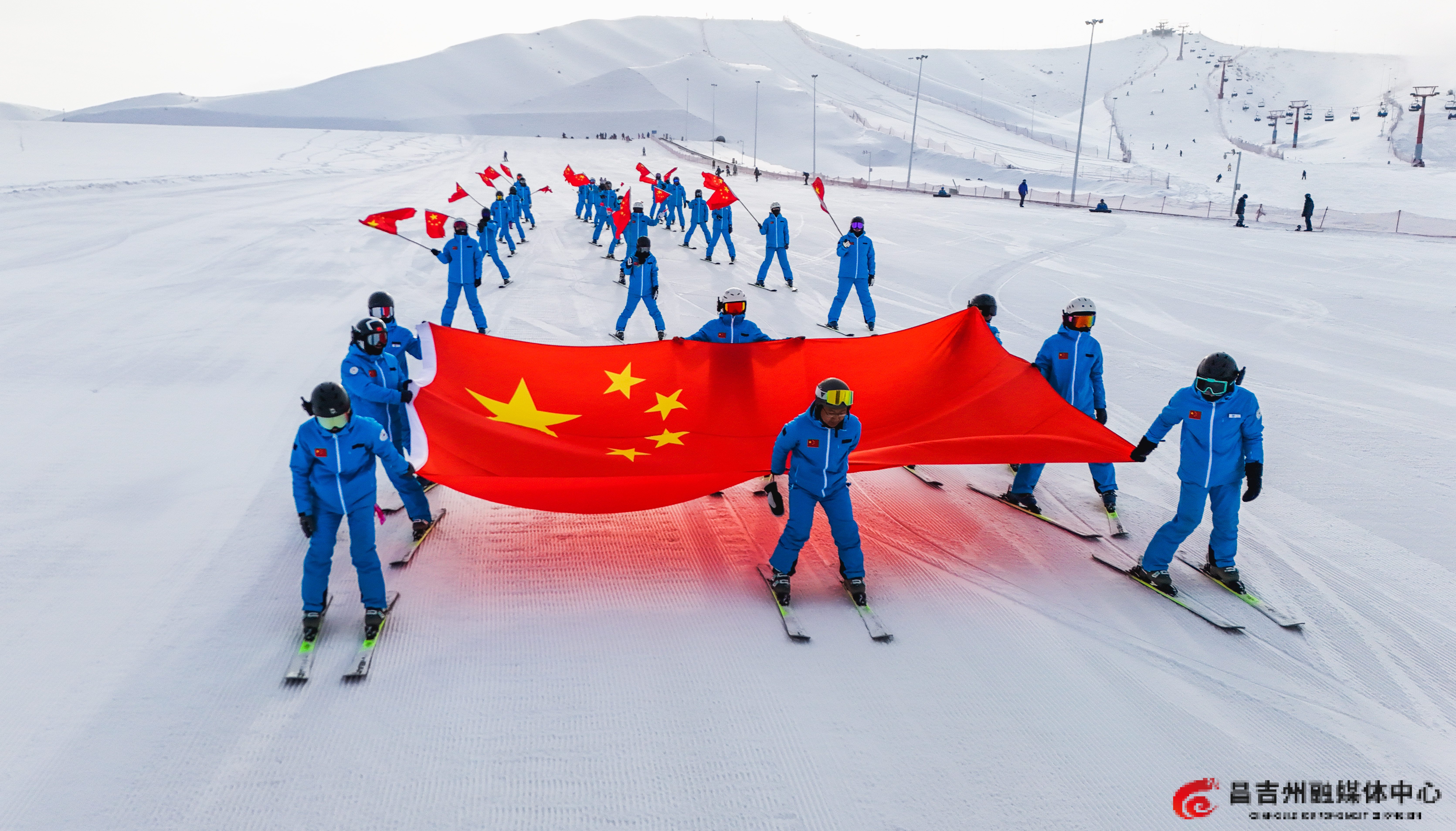 活动现场,国旗方阵从初级雪道上整齐滑下。