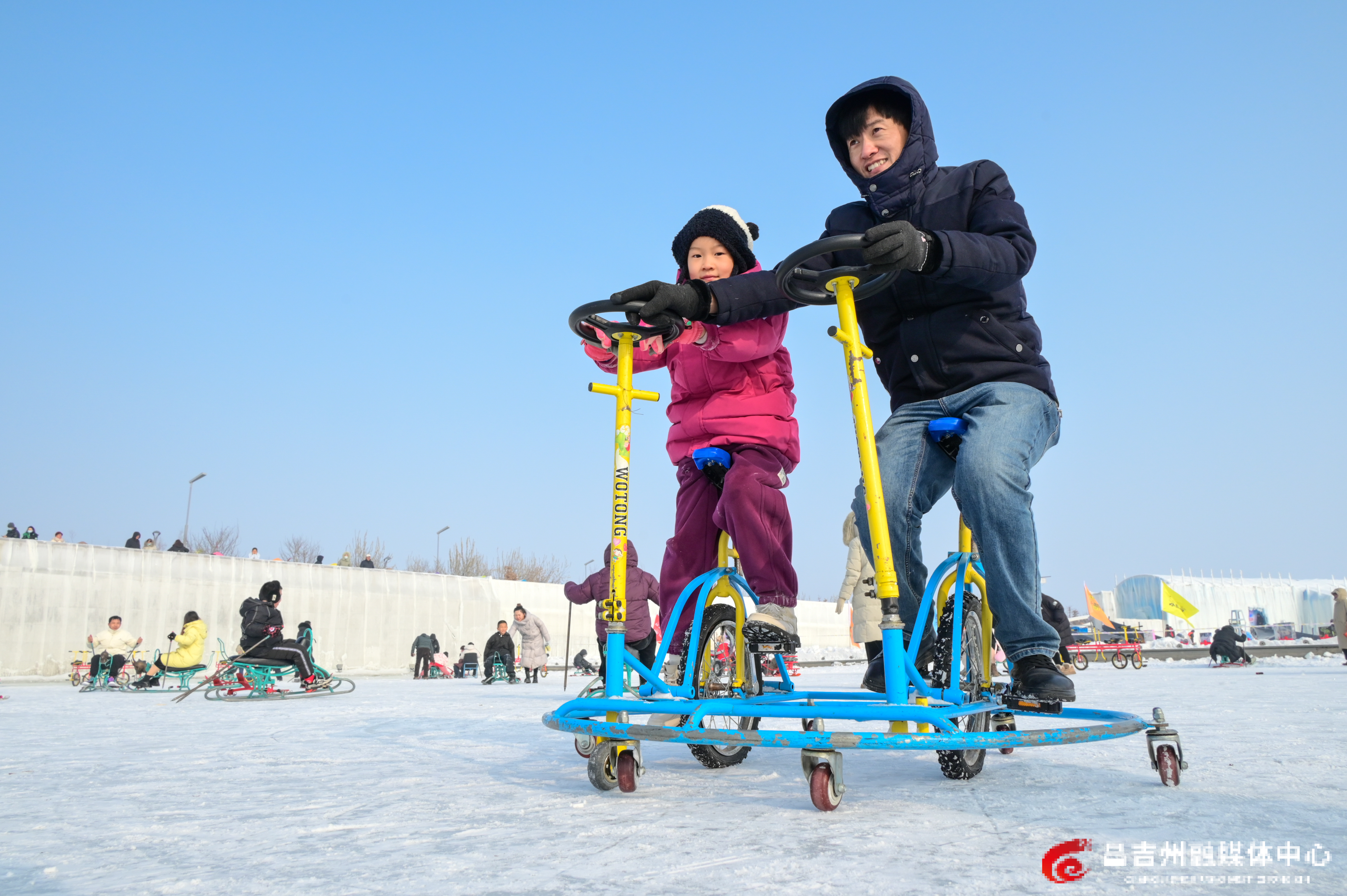 1月11日,昌吉市庭州生态绿谷“丝路冰城”冰雪大世界,游客在体验冰上自行车。