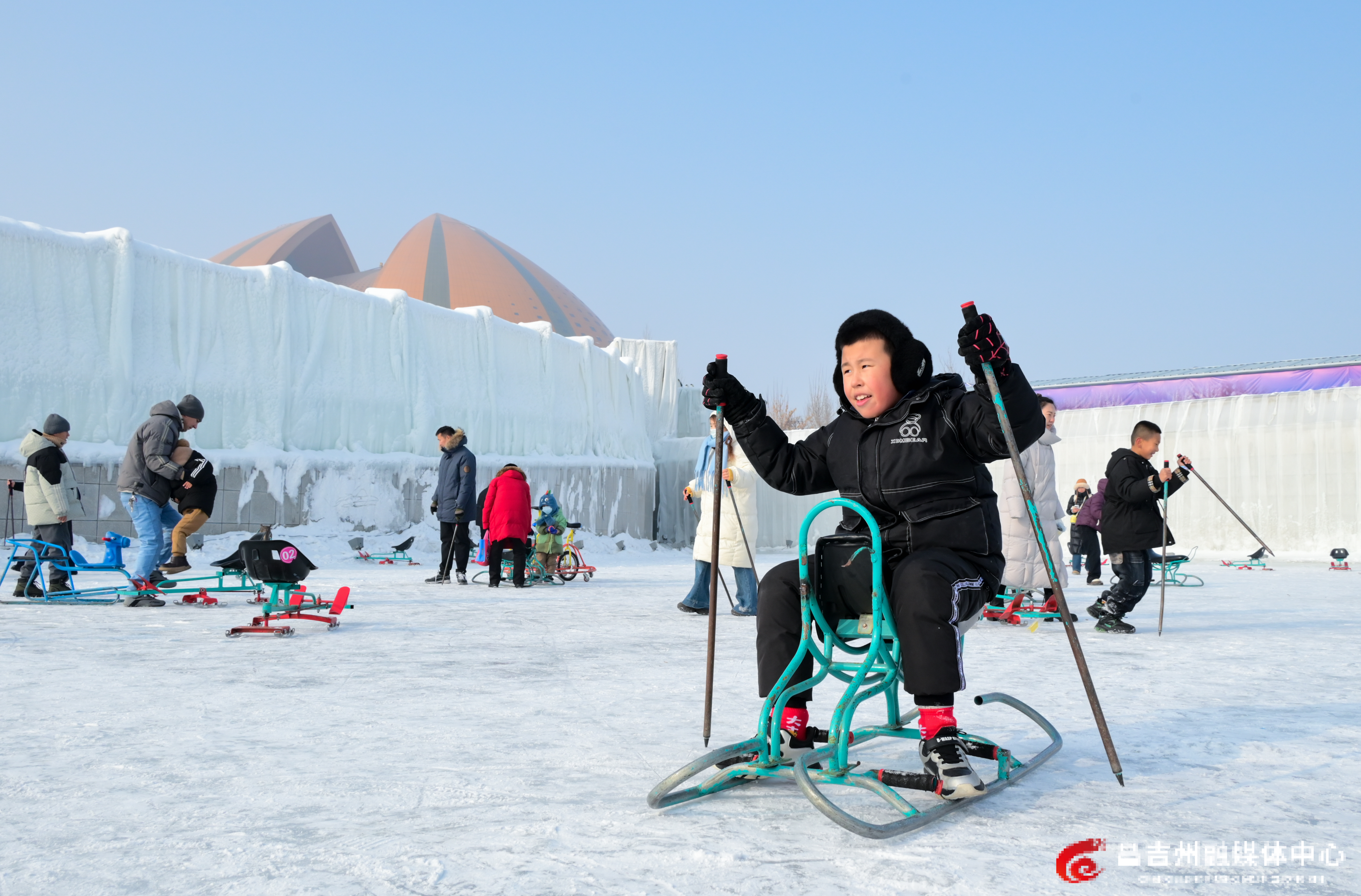 1月11日,昌吉市庭州生态绿谷“丝路冰城”冰雪大世界,游客在体验冰爬犁。
