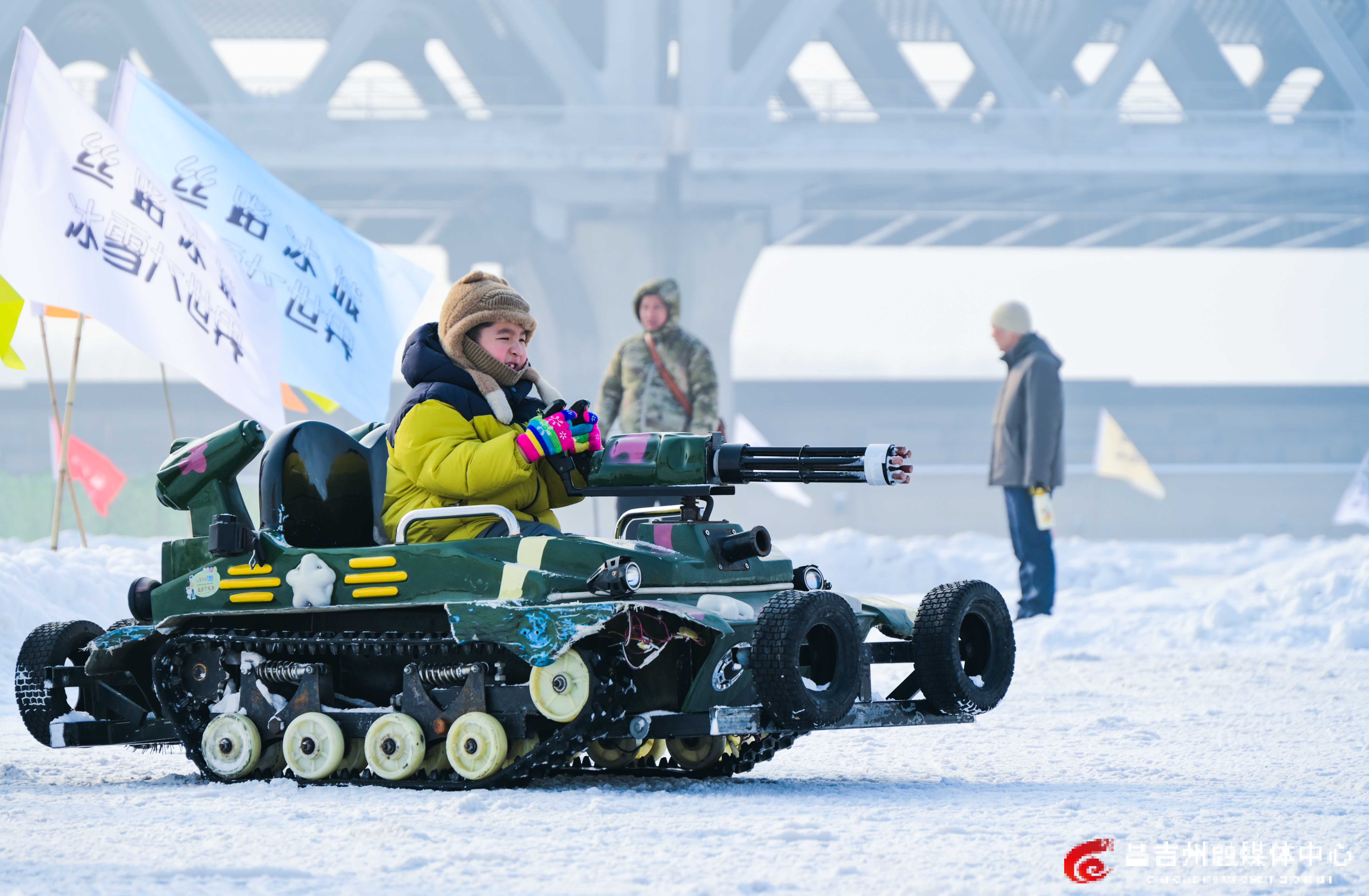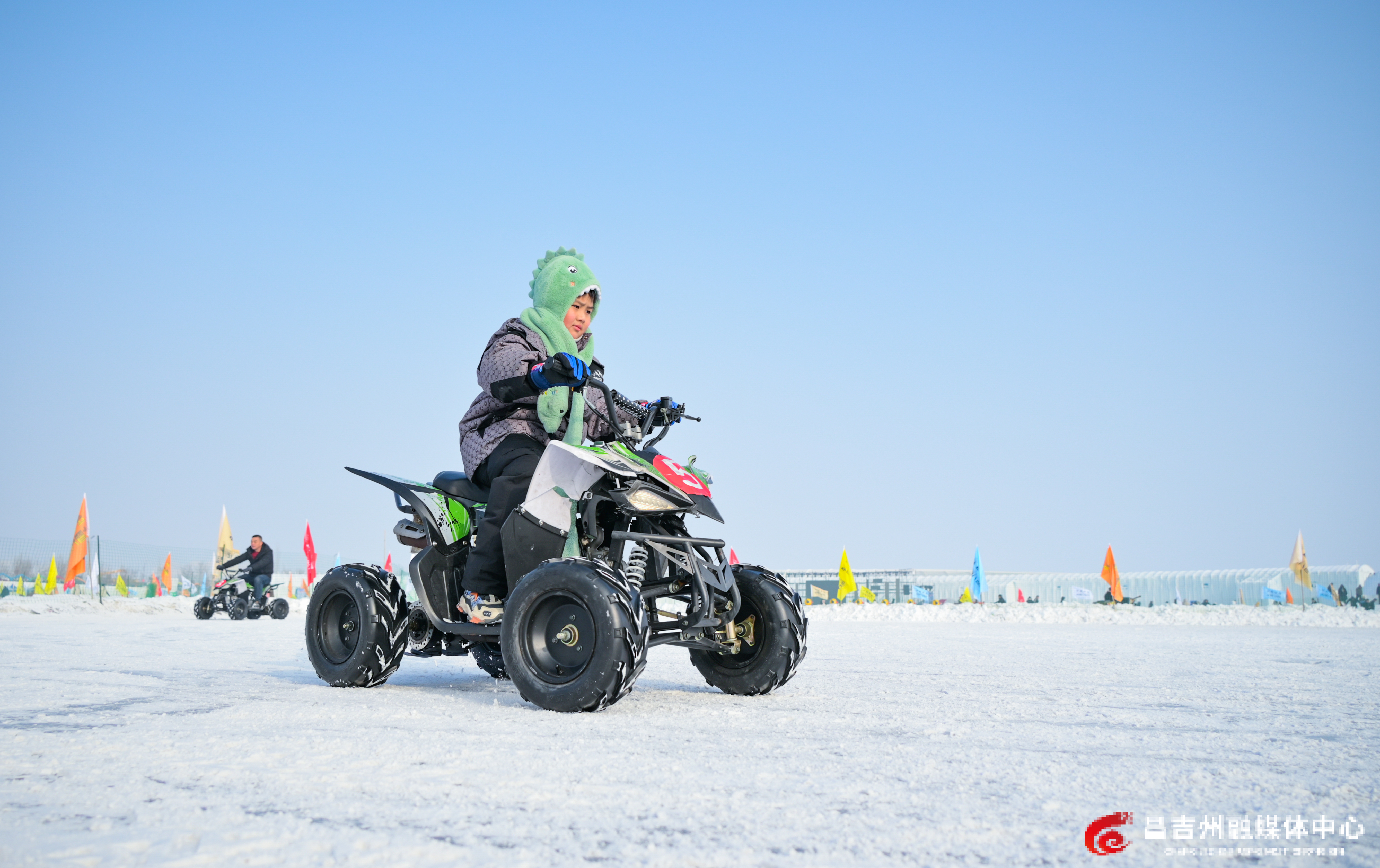 1月11日,昌吉市庭州生态绿谷“丝路冰城”冰雪大世界,小朋友在体验雪地坦克。
